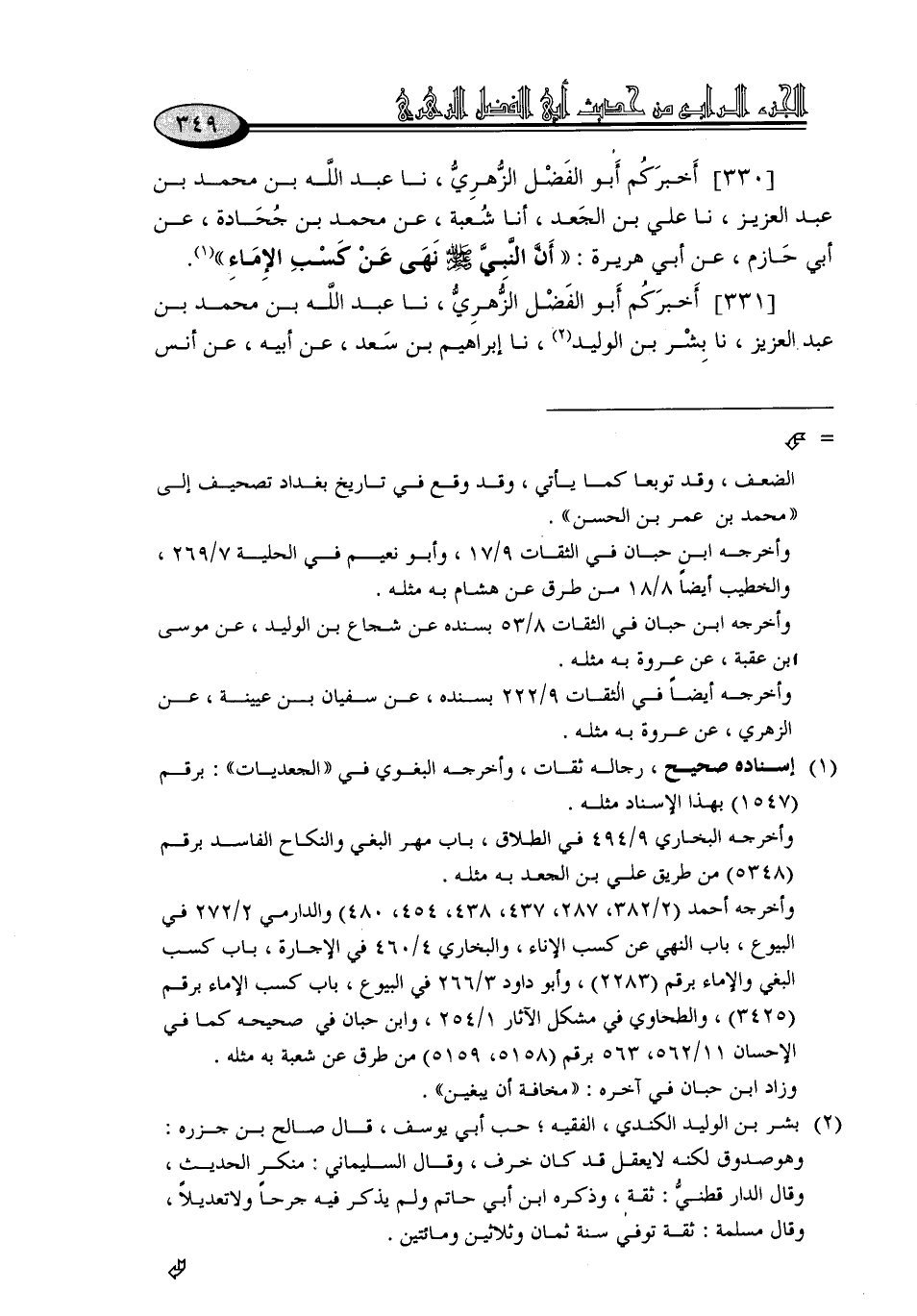 330 - أَخْبَرَكُمْ أَبُو الْفَضْلِ الزُّهْرِيُّ، نا عَبْدُ اللَّهِ بْنُ مُحَمَّدِ بْنِ عَبْدِ الْعَزِيزِ، نا عَلِيُّ بْنُ الْجَعْدِ، أنا شُعْبَةُ، عَنْ مُحَمَّدِ بْنِ جُحَادَةَ، عَنْ أَبِي حَازِمٍ، عَنْ أَبِي هُرَيْرَةَ: «أَنَّ النَّبِيَّ صَلَّى اللَّهُ عَلَيْهِ وَسَلَّمَ نَهَى عَنْ كَسْبِ الْإِمَاءِ»