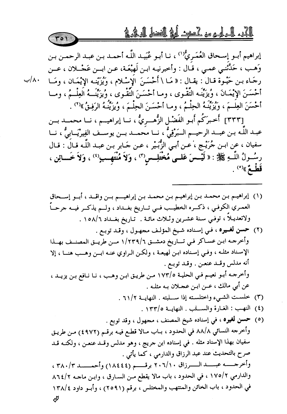 333 - أَخْبَرَكُمْ أَبُو الْفَضْلِ الزُّهْرِيُّ، نا إِبْرَاهِيمُ، نا مُحَمَّدُ بْنُ عَبْدِ اللَّهِ بْنِ عَبْدِ الرَّحِيمِ الْبَرْقِيُّ، نا مُحَمَّدُ بْنُ يُوسُفَ الْفِرْيَابِيُّ، نا سُفْيَانُ، عَنِ ابْنِ جُرَيْجٍ، عَنْ أَبِي الزُّبَيْرِ، عَنْ جَابِرِ بْنِ عَبْدِ اللَّهِ، قَالَ: قَالَ رَسُولُ اللَّهِ صَلَّى اللَّهُ عَلَيْهِ وَسَلَّمَ: «لَيْسَ عَلَى مُخْتَلِسٍ، وَلَا مُنْتَهِبٍ، وَلَا خَائِنٍ، قَطْعٌ»
