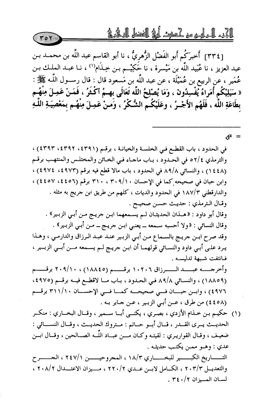 334 - أَخْبَرَكُمْ أَبُو الْفَضْلِ الزُّهْرِيُّ، نا أَبُو الْقَاسِمِ عَبْدُ اللَّهِ بْنُ مُحَمَّدِ بْنِ عَبْدِ الْعَزِيزِ، نا عُبَيْدُ اللَّهِ بْنُ مَيْسَرَةَ، نا حَكِيمُ بْنُ خِذَامٍ، نا عَبْدُ الْمَلِكِ بْنُ عُمَيْرٍ، عَنِ الرَّبِيعِ بْنِ عَمِيلَةَ، عَنْ عَبْدِ اللَّهِ بْنِ مَسْعُودٍ، قَالَ: قَالَ رَسُولُ اللَّهِ صَلَّى اللَّهُ عَلَيْهِ وَسَلَّمَ: «سَيَلِيكُمْ أُمَرَاءُ يُفْسِدُونَ، وَمَا يُصْلِحُ اللَّهُ تَعَالَى بِهِمْ أَكْثَرُ، فَمَنْ عَمِلَ مِنْهُمْ بِطَاعَةِ اللَّهِ، فَلَهُمُ الْأَجْرُ، وَعَلَيْكُمُ الشُّكْرُ، وَمَنْ عَمِلَ مِنْهُمْ بِمَعْصِيَةِ اللَّهِ -[353]- فَعَلَيْهِمُ الْوِزْرُ , وَعَلَيْكُمُ الصَّبْرُ»
