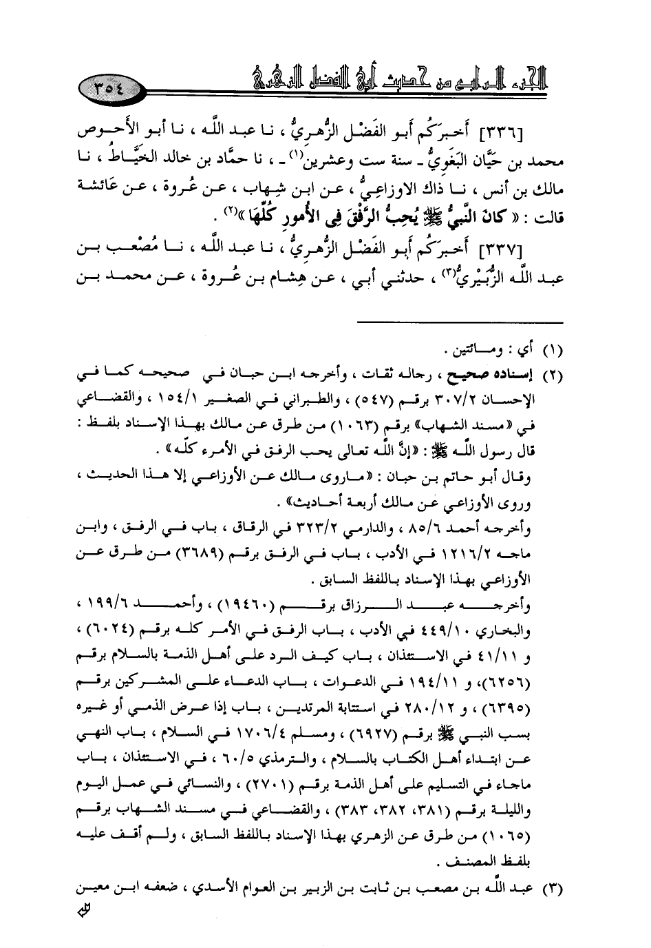 336 - أَخْبَرَكُمْ أَبُو الْفَضْلِ الزُّهْرِيُّ، نا عَبْدُ اللَّهِ، نا أَبُو الْأَحْوَصِ مُحَمَّدُ بْنُ حَيَّانَ الْبَغَوِيُّ - سَنَةَ سِتٍّ وَعِشْرِينَ - نا حَمَّادُ بْنُ خَالِدٍ الْخَيَّاطُ، نا مَالِكُ بْنُ أَنَسٍ، نا ذَاكَ الْأَوْزَاعِيُّ، عَنِ ابْنِ شِهَابٍ، عَنْ عُرْوَةَ، عَنْ عَائِشَةَ، قَالَتْ: «كَانَ النَّبِيُّ صَلَّى اللَّهُ عَلَيْهِ وَسَلَّمَ يُحِبُّ الرِّفْقَ فِي الْأُمُورِ كُلِّهَا»