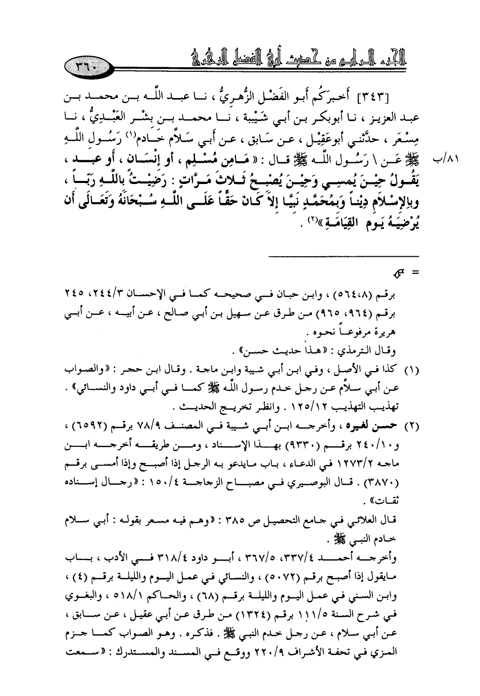 343 - أَخْبَرَكُمْ أَبُو الْفَضْلِ الزُّهْرِيُّ، نا عَبْدُ اللَّهِ بْنُ مُحَمَّدِ بْنِ عَبْدِ الْعَزِيزِ، نا أَبُو بَكْرِ بْنُ أَبِي شَيْبَةَ، نا مُحَمَّدُ بْنُ بِشْرٍ الْعَبْدِيُّ، نا مِسْعَرٌ، حَدَّثَنِي أَبُو عَقِيلٍ، عَنْ سَابِقٍ، عَنْ أَبِي سَلَّامٍ، خَادِمِ رَسُولِ اللَّهِ صَلَّى اللَّهُ عَلَيْهِ وَسَلَّمَ عَنْ رَسُولِ اللَّهِ صَلَّى اللَّهُ عَلَيْهِ وَسَلَّمَ قَالَ: " مَا مِنْ مُسْلِمٍ، أَوْ إِنْسَانٍ، أَوْ عَبْدٍ يَقُولُ حِينَ يُمْسِي وَحِينَ يُصْبِحُ ثَلَاثَ مَرَّاتٍ: رَضِيتُ بِاللَّهِ رَبًّا، وَبِالْإِسْلَامِ دِينًا , وَبمُحَمَّدٍ نَبِيًّا إِلَّا كَانَ حَقًّا عَلَى اللَّهِ سُبْحَانَهُ وَتَعَالَى أَنْ يُرْضِيَهُ يَوْمَ الْقِيَامَةِ "