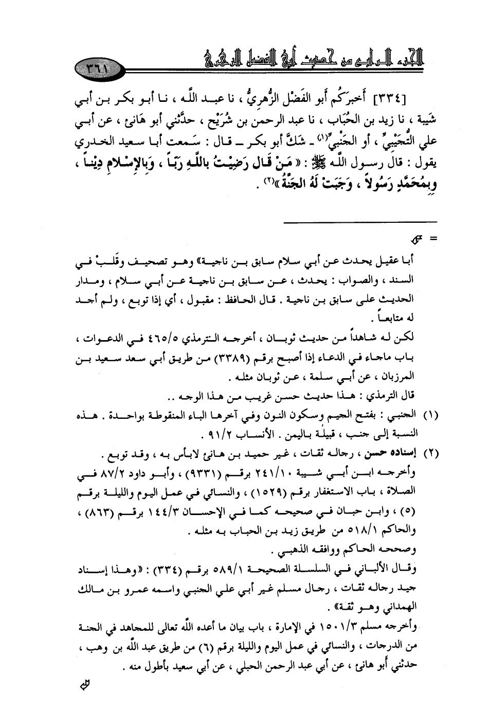 344 - أَخْبَرَكُمْ أَبُو الْفَضْلِ الزُّهْرِيُّ، نا عَبْدُ اللَّهِ، نا أَبُو بَكْرِ بْنُ أَبِي شَيْبَةَ، نا زَيْدُ بْنُ الْحُبَابِ، نا عَبْدُ الرَّحْمَنِ بْنُ شُرَيْحٍ، حَدَّثَنِي أَبُو هَانِئٍ، عَنْ أَبِي عَلِيٍّ التُّجِيبِيِّ أَوِ الْجَنْبِيِّ - شَكَّ أَبُو بَكْرٍ - قَالَ: سَمِعْتُ أَبَا سَعِيدٍ الْخُدْرِيَّ، يَقُولُ: قَالَ رَسُولُ اللَّهِ صَلَّى اللَّهُ عَلَيْهِ وَسَلَّمَ: " مَنْ قَالَ: رَضِيتُ بِاللَّهِ رَبًّا، وَبِالْإِسْلَامِ دِينًا، وَبِمُحَمَّدٍ رَسُولًا، وَجَبَتْ لَهُ الْجَنَّةُ "