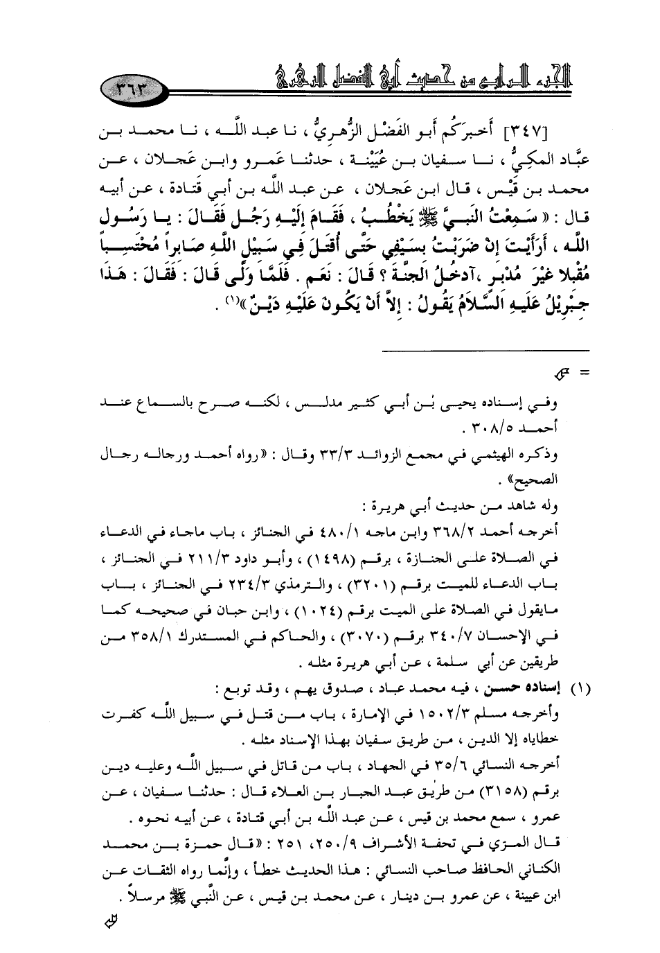347 - أَخْبَرَكُمْ أَبُو الْفَضْلِ الزُّهْرِيُّ، نا عَبْدُ اللَّهِ، نا مُحَمَّدُ بْنُ عَبَّادٍ الْمَكِّيُّ، نا سُفْيَانُ بْنُ عُيَيْنَةَ، حَدَّثَنَا عَمْرٌو، وَابْنُ عَجْلَانَ، عَنْ مُحَمَّدِ بْنِ قَيْسٍ، قَالَ ابْنُ عَجْلَانَ، عَنْ عَبْدِ اللَّهِ بْنِ أَبِي قَتَادَةَ، عَنْ أَبِيهِ، قَالَ: " سَمِعْتُ النَّبِيَّ صَلَّى اللَّهُ عَلَيْهِ وَسَلَّمَ يَخْطُبُ، فَقَامَ إِلَيْهِ رَجُلٌ , فَقَالَ: يَا رَسُولَ اللَّهِ، أَرَأَيْتَ إِنْ ضَرَبْتُ بِسَيْفِي حَتَّى أُقْتَلَ فِي سَبِيلِ اللَّهِ صَابِرًا مُحْتَسِبًا مُقْبِلًا غَيْرَ مُدْبِرٍ، أَدْخَلُ الْجَنَّةَ؟ قَالَ: «نَعَمْ»، فَلَمَّا وَلَّى قَالَ: فَقَالَ: " هَذَا جِبْرِيلُ عَلَيْهِ السَّلَامُ يَقُولُ: إِلَّا أَنْ يَكُونَ عَلَيْهِ دَيْنٌ "