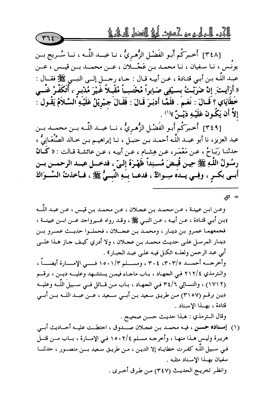 348 - أَخْبَرَكُمْ أَبُو الْفَضْلِ الزُّهْرِيُّ، نا عَبْدُ اللَّهِ، نا سُرَيْجُ بْنُ يُونُسَ، نا سُفْيَانُ، نا مُحَمَّدُ بْنُ عَجْلَانَ، عَنْ مُحَمَّدِ بْنِ قَيْسٍ، عَنْ عَبْدِ اللَّهِ بْنِ أَبِي قَتَادَةَ، عَنْ أَبِيهِ، قَالَ: جَاءَ رَجُلٌ إِلَى النَّبِيِّ صَلَّى اللَّهُ عَلَيْهِ وَسَلَّمَ , فَقَالَ: أَرَأَيْتَ إِنْ ضَرَبْتُ بِسَيْفِي صَابِرًا مُحْتَسِبًا مُقْبِلًا غَيْرَ مُدْبِرٍ، أَتُكَفَّرُ عَنِّي خَطَايَايَ؟ قَالَ: «نَعَمْ»، فَلَمَّا أَدْبَرَ قَالَ: " فَقَالَ جِبْرِيلُ عَلَيْهِ السَّلَامُ يَقُولُ: إِلَّا أَنْ يَكُونَ عَلَيْهِ دَيْنٌ "