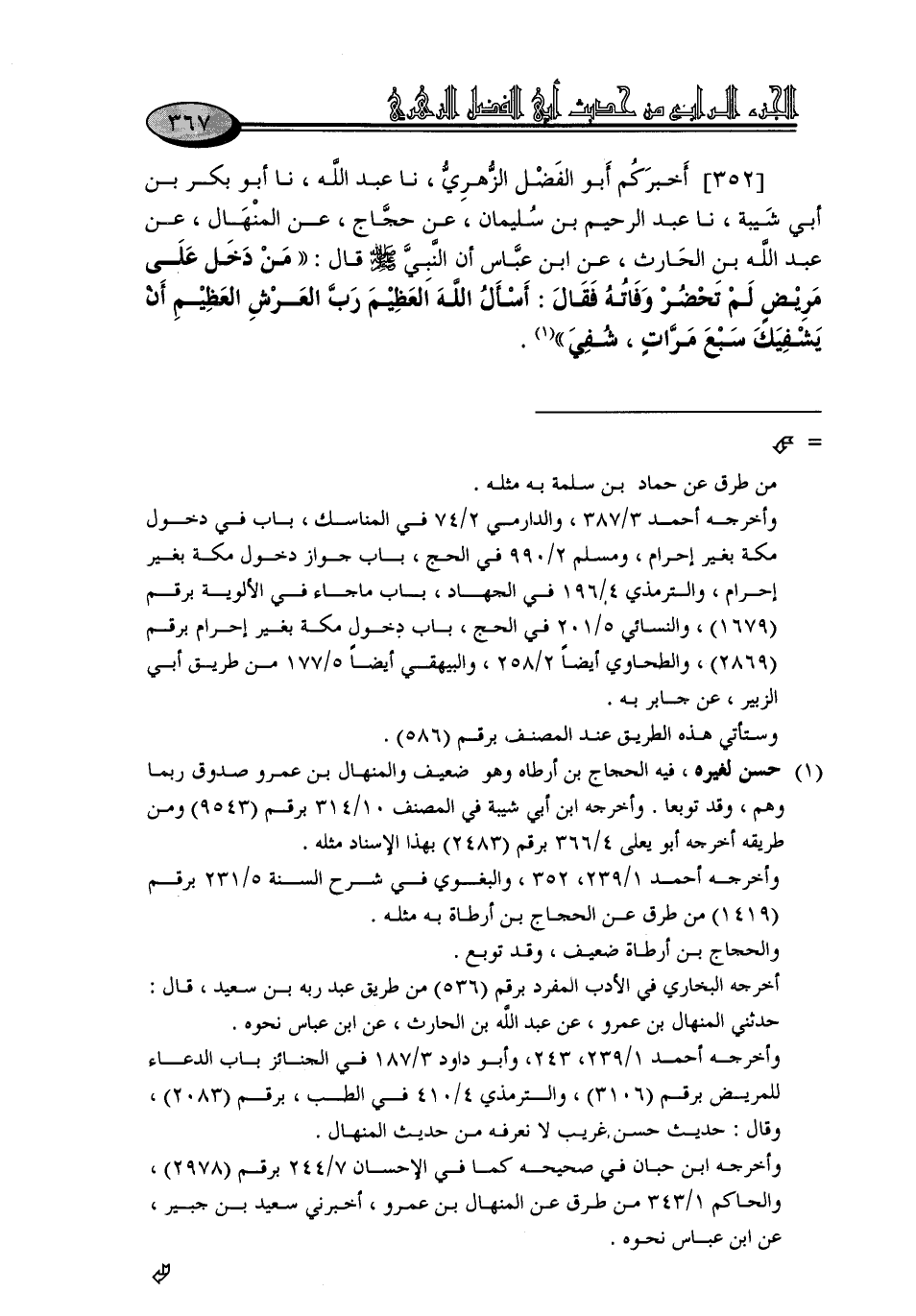 352 - أَخْبَرَكُمْ أَبُو الْفَضْلِ الزُّهْرِيُّ، نا عَبْدُ اللَّهِ، نا أَبُو بَكْرِ بْنُ أَبِي شَيْبَةَ، نا عَبْدُ الرَّحِيمِ بْنُ سُلَيْمَانَ، عَنْ حَجَّاجٍ، عَنِ الْمِنْهَالِ، عَنْ عَبْدِ اللَّهِ بْنِ الْحَارِثِ، عَنِ ابْنِ عَبَّاسٍ، أَنَّ النَّبِيَّ صَلَّى اللَّهُ عَلَيْهِ وَسَلَّمَ قَالَ: " مَنْ دَخَلَ عَلَى مَرِيضٍ لَمْ تَحْضُرْ وَفَاتُهُ , فَقَالَ: أَسْأَلُ اللَّهَ الْعَظِيمَ رَبَّ الْعَرْشِ الْعَظِيمِ أَنْ يَشْفِيَكَ سَبْعَ مَرَّاتٍ، شُفَيَ "