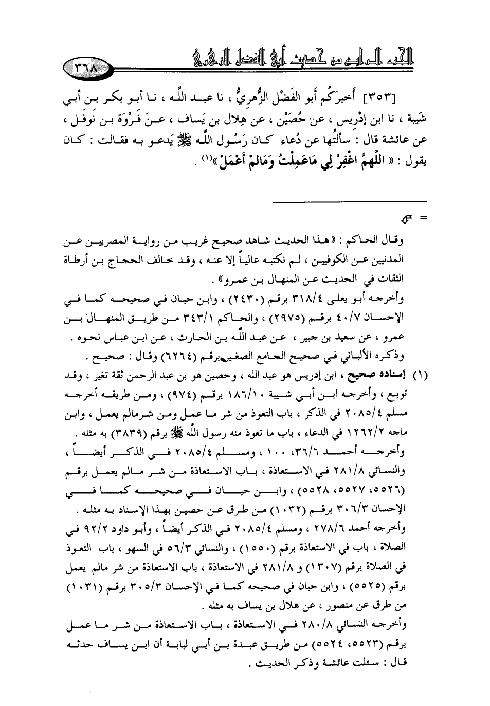 353 - أَخْبَرَكُمْ أَبُو الْفَضْلِ الزُّهْرِيُّ، نا عَبْدُ اللَّهِ، نا أَبُو بَكْرِ بْنُ أَبِي شَيْبَةَ، نا ابْنُ إِدْرِيسَ، عَنْ حُصَيْنٍ، عَنْ هِلَالِ بْنِ يَسَافٍ، عَنْ فَرْوَةَ بْنِ نَوْفَلٍ، عَنْ عَائِشَةَ، قَالَ: سَأَلْتُهَا عَنْ دُعَاءٍ، كَانَ رَسُولُ اللَّهِ صَلَّى اللَّهُ عَلَيْهِ وَسَلَّمَ يَدْعُو بِهِ , فَقَالَتْ: كَانَ يَقُولُ: «اللَّهُمَّ , اغْفِرْ لِي مَا عَمِلْتُ , وَمَا لَمْ أَعْمَلْ»