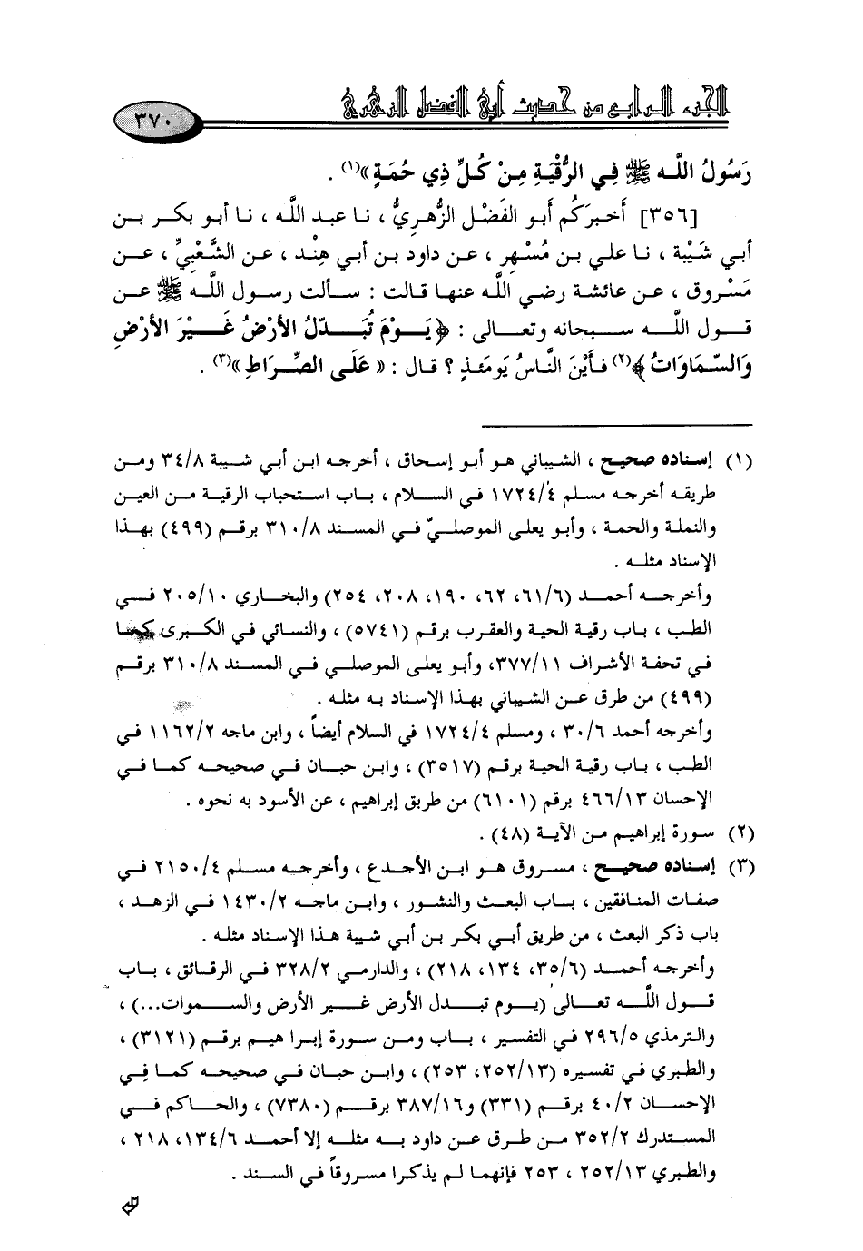 356 - أَخْبَرَكُمْ أَبُو الْفَضْلِ الزُّهْرِيُّ، نا عَبْدُ اللَّهِ، نا أَبُو بَكْرِ بْنُ أَبِي شَيْبَةَ، نا عَلِيُّ بْنُ مُسْهِرٍ، عَنْ دَاوُدَ بْنِ أَبِي هِنْدَ، عَنِ الشَّعْبِيِّ، عَنْ مَسْرُوقٍ، عَنْ عَائِشَةَ، رَضِيَ اللَّهُ عَنْهَا، قَالَتْ: سَأَلْتُ رَسُولَ اللَّهِ صَلَّى اللَّهُ عَلَيْهِ وَسَلَّمَ عَنْ قَوْلِ اللَّهِ سُبْحَانَهُ وَتَعَالَى: {يَوْمَ تُبَدَّلُ الْأَرْضُ غَيْرَ الْأَرْضِ وَالسَّمَوَاتُ} , فَأَيْنَ النَّاسُ يَوْمَئِذٍ؟ قَالَ: «عَلَى الصِّرَاطِ»