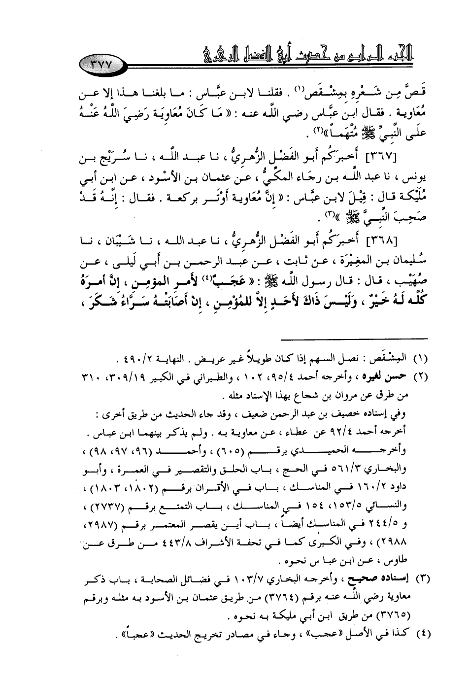 368 - أَخْبَرَكُمْ أَبُو الْفَضْلِ الزُّهْرِيُّ، نا عَبْدُ اللَّهِ، نا شَيْبَانُ، نا سُلَيْمَانُ بْنُ الْمُغِيرَةِ، عَنْ ثَابِتٍ، عَنْ عَبْدِ الرَّحْمَنِ بْنِ أَبِي لَيْلَى، عَنْ صُهَيْبٍ، قَالَ: قَالَ رَسُولُ اللَّهِ صَلَّى اللَّهُ عَلَيْهِ وَسَلَّمَ: «عَجَبٌ لِأَمْرِ الْمُؤْمِنِ، إِنَّ أَمْرَهُ كُلَّهُ لَهُ خَيْرٌ، وَلَيْسَ ذَاكَ لِأَحَدٍ إِلَّا لِلْمُؤْمِنِ، إِنْ أَصَابَتْهُ سَرَّاءُ شَكَرَ، -[378]- فَكَانَ خَيْرٌ لَهُ، وَإِنْ أَصَابَتْهُ ضَرَّاءُ صَبَرَ , وَكَانَ خَيْرٌ لَهُ»