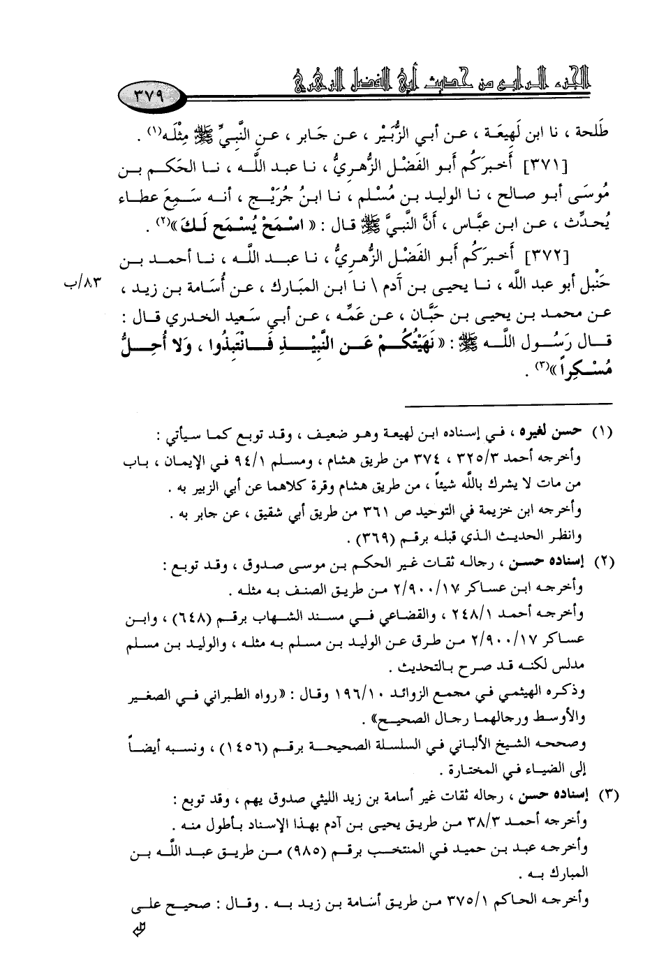 372 - أَخْبَرَكُمْ أَبُو الْفَضْلِ الزُّهْرِيُّ، نا عَبْدُ اللَّهِ، نا أَحْمَدُ بْنُ حَنْبَلٍ أَبُو عَبْدِ اللَّهِ، نا يَحْيَى بْنُ آدَمَ، نا ابْنُ الْمُبَارَكِ، عَنْ أُسَامَةَ بْنِ زَيْدٍ، عَنْ مُحَمَّدِ بْنِ يَحْيَى بْنِ حِبَّانَ، عَنْ عَمِّهِ، عَنْ أَبِي سَعِيدٍ الْخُدْرِيِّ، قَالَ: قَالَ رَسُولُ اللَّهِ صَلَّى اللَّهُ عَلَيْهِ وَسَلَّمَ: «نَهَيْتُكُمْ عَنِ النَّبِيذِ فَانْتَبِذُوا، وَلَا أُحِلُّ مُسْكِرًا»