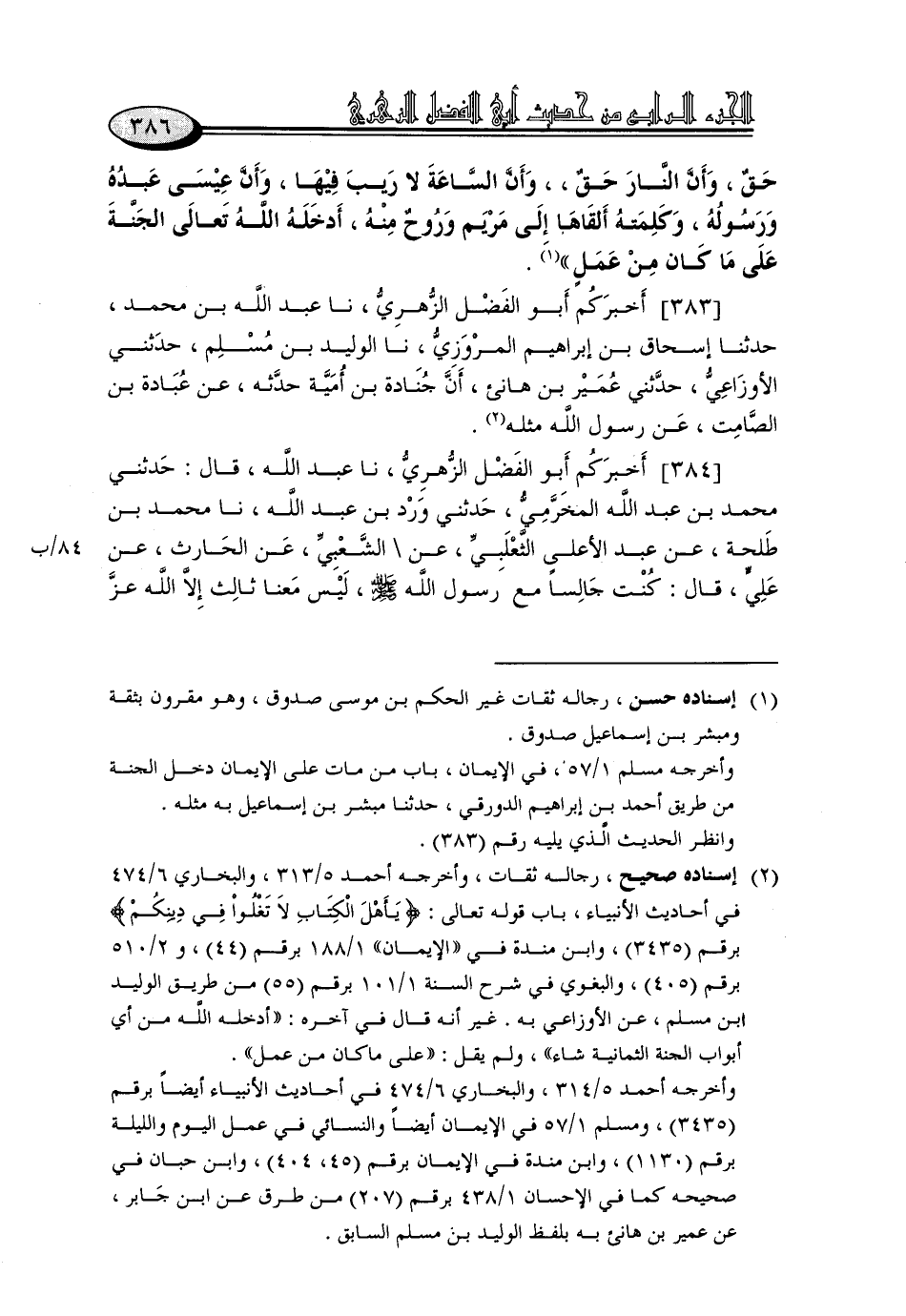 384 - أَخْبَرَكُمْ أَبُو الْفَضْلِ الزُّهْرِيُّ، نا عَبْدُ اللَّهِ، قَالَ: حَدَّثَنِي مُحَمَّدُ بْنُ عَبْدِ اللَّهِ الْمَخْرَمِيُّ، حَدَّثَنِي وَرْدُ بْنُ عَبْدِ اللَّهِ، نا مُحَمَّدُ بْنُ طَلْحَةَ، عَنْ عَبْدِ الْأَعْلَى الثَّعْلَبِيِّ، عَنِ الشَّعْبِيِّ، عَنِ الْحَارِثِ، عَنْ عَلِيٍّ، قَالَ: كُنْتُ جَالِسًا مَعَ رَسُولِ اللَّهِ صَلَّى اللَّهُ عَلَيْهِ وَسَلَّمَ، لَيْسَ مَعَنَا ثَالِثٌ إِلَّا اللَّهُ عَزَّ -[387]- وَجَلَّ، فَأَقْبَلَ أَبُو بَكْرٍ وَعُمَرُ رَضِيَ اللَّهُ عَنْهُمَا , فَقَالَ: «هَذَانِ سَيِّدَا كُهُولِ أَهْلِ الْجَنَّةِ مِنَ الْأَوَّلِينَ وَالْآخِرِينَ، إِلَّا النَّبِيِّينَ وَالْمُرْسَلِينَ»
