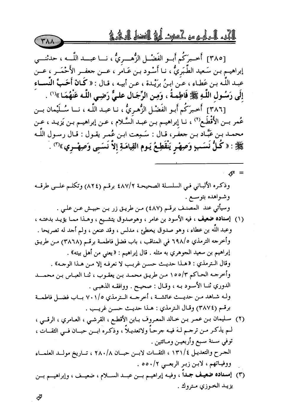 386 - أَخْبَرَكُمْ أَبُو الْفَضْلِ الزُّهْرِيُّ، نا عَبْدُ اللَّهِ، نا سُلَيْمَانُ بْنُ عُمَرَ بْنِ الْأَقْطَعِ، نا إِبْرَاهِيمُ بْنُ عَبْدِ السَّلَامِ، عَنْ إِبْرَاهِيمَ بْنِ يَزِيدَ، عَنْ مُحَمَّدِ بْنِ عَبَّادِ بْنِ جَعْفَرٍ، قَالَ: سَمِعْتُ ابْنَ عُمَرَ، يَقُولُ: قَالَ رَسُولُ اللَّهِ صَلَّى اللَّهُ عَلَيْهِ وَسَلَّمَ: «كُلُّ نَسَبٍ وَصِهْرٍ يَنْقَطِعُ يَوْمَ الْقِيَامَةِ إِلَّا نَسَبِي وَصِهْرِي»