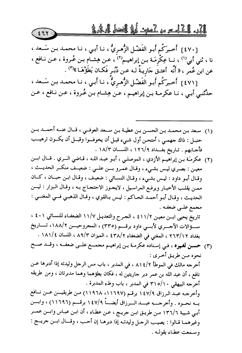 470 - أَخْبَرَكُمْ أَبُو الْفَضْلِ الزُّهْرِيُّ، نا أبي، نا مُحَمَّدُ بْنُ سَعْدٍ، نا، ثني أَبِي، نا عِكْرِمَةُ بْنُ إِبْرَاهِيمَ، عَنْ هِشَامِ بْنِ عُرْوَةَ، عَنْ نَافِعٍ، عَنِ ابْنِ عُمَرَ: «أَنَّهُ أَعْتَقَ جَارِيَةً لَهُ عَنْ دُبُرٍ، فَكَانَ يَطَؤُهَا.»
