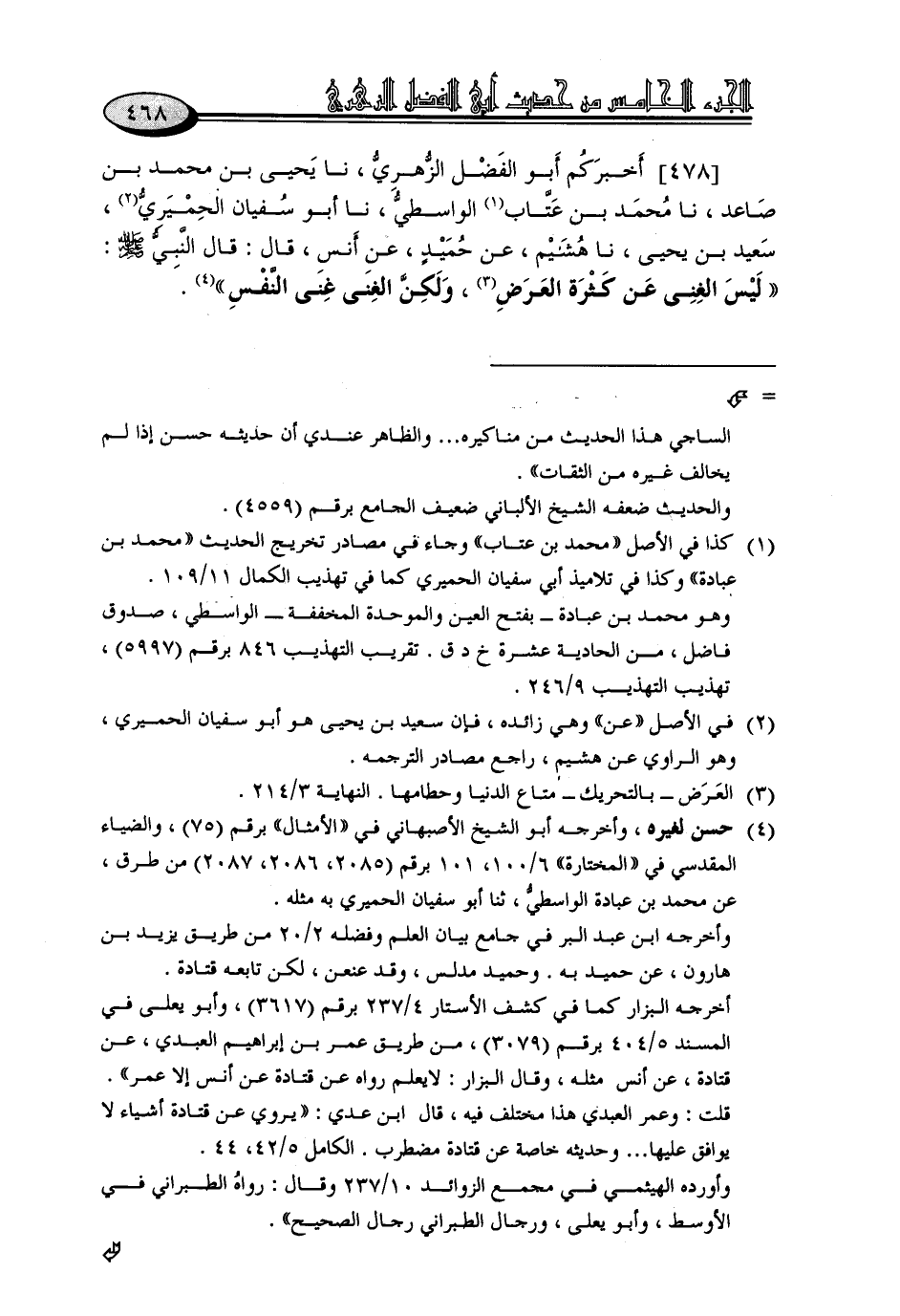 478 - أَخْبَرَكُمْ أَبُو الْفَضْلِ الزُّهْرِيُّ، نا يَحْيَى بْنُ مُحَمَّدِ بْنِ صَاعِدٍ، نا مُحَمَّدُ بْنُ عَتَّابٍ الْوَاسِطِيُّ، نا أَبُو سُفْيَانَ الْحِمْيَرِيُّ سَعِيدُ بْنُ يَحْيَى، نا هُشَيْمٌ، عَنْ حُمَيْدٍ، عَنْ أَنَسٍ، قَالَ: قَالَ النَّبِيُّ صَلَّى اللَّهُ عَلَيْهِ وَسَلَّمَ: «لَيْسَ الْغِنَى عَنْ كَثْرَةِ الْعَرَضَ، وَلَكِنَّ الْغِنَى غِنَى النَّفْسِ»