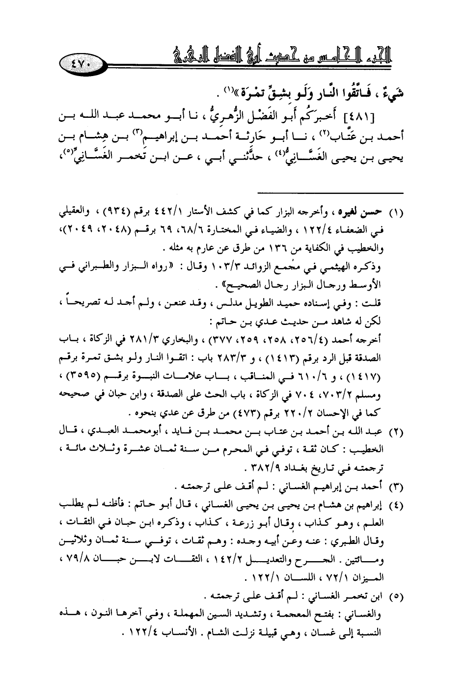 481 - أَخْبَرَكُمْ أَبُو الْفَضْلِ الزُّهْرِيُّ، نا أَبُو مُحَمَّدٍ عَبْدُ اللَّهِ بْنُ أَحْمَدَ بْنِ عَتَّابٍ، نا أَبُو حَارِثَةَ أَحْمَدُ بْنُ إِبْرَاهِيمَ بْنِ هِشَامِ بْنِ يَحْيَى بْنِ يَحْيَى الْغَسَّانِيُّ، حَدَّثَنِي أَبِي، عَنِ ابْنِ تَخْمُرَ الْغَسَّانِيِّ، -[471]- قَالَ: أَتَانَا رَجُلٌ يَسْأَلُ عَنْ إِبْرَاهِيمَ بْنِ أَدْهَمَ، فَأَعْلَمْنَاهُ أَنَّا لَا نَعْرِفُهُ وَلَا نَعْرِفُ لَهُ مَوْضِعًا، فَقَالَ: بَلَى، لَمْ أَزَلْ عَلَى صِحَّةٍ مِنْ خَبَرِهِ إِلَى أَنْ دَخَلَ إِلَى مَدِينَةِ عَسْقَلَانَ، فَقَالَ رَجُلٌ مِنَ الْقَوْمِ. عِنْدِي نَاظُورٌ فِي بُسْتَانٍ قَدْ أَنْكَرْتُ أَمْرَهُ وَهُوَ خَلِيقٌ أَنْ يَكُونَ هُوَ، وَذَلِكَ أَنِّي خَرَجْتُ فِي جَمَاعَةٍ مِنْ أَصْحَابِ الْبُسْتَانِ، فَسَأَلْتُهُ أَنْ يَأْتِيَنِي بِرُمَّانٍ حُلْو، فَأَتَانِي بِرُمَّانٍ حَامِضٍ، فَقُلْتُ لَهُ: مِنْ هَذَا تَأْكُلُ؟، فَقَالَ: وَمَا آكُلُ مِنْ مَتَاعِي، إِنَّمَا اكْتَرَوْنِي لِأَحْفَظَهُ، فَقَالَ الرَّجُلُ: يَنْبَغِي أَنْ يَكُونَ هُوَ صَاحِبِي، فَقُمْنَا بِأَجْمَعِنَا حَتَّى وَقَفْنَا عَلَى بَابِ الْبُسْتَانِ، فَاسْتَفْتَحَ صَاحِبُهُ، فَخَرَجَ إِلَيْنَا، فَإِذَا هُوَ إِبْرَاهِيمُ بْنُ أَدْهَمَ، فَسَلَّمَ عَلَيْهِ الرَّجُلُ، فَقَالَ: مَا حَاجَتُكَ؟ قَالَ: مَوْلَايَ، فُلَانٌ مَاتَ وَخَلَّفَ شَيْئًا جِئْتُكَ بِهِ، قَالَ: فَبَسَطَ إِبْرَاهِيمُ كِسَاءَهُ، وَقَالَ لَهُ: هَاتِ، فَصَبَّ فِيهِ ثَلَاثِينَ أَلْفَ دِرْهَمٍ، فَقَالَ لِلرَّجُلِ: اقْسِمْهَا ثَلَاثًا، فَفَعَلَ، فَقَالَ لَنَا: خُذُوا عَشْرَةَ آلَافِ دِرْهَمٍ فَفَرِّقُوهَا عَلَى الضُّعَفَاءِ وَالْمَسَاكِينِ بِعَسْقَلَانَ، وَعَشَرَةَ آلَافِ دِرْهَمٍ فَرَمُّوا بِهَا الْحَائِطَ فَقَدْ رَأَيْتُهُ تَشَعَّثَ، وَقَالَ لِلرَّسُولِ: خُذْ أَنْتَ عَشْرَةَ آلَافٍ بِعْنَاكَ مِنْ بَلْخٍ، فَمَا وَضَعَ يَدَهُ عَلَى دِرْهَمٍ مِنْهَا، وَأَخَذَ كِسَاءَهُ فَوَضَعَهُ عَلَى عُنُقِهِ، -[472]- وَخَرَجَ مِنْ عَسْقَلَانَ فَمَا عَلِمْنَاهُ عَادَ إِلَيْهَا "
