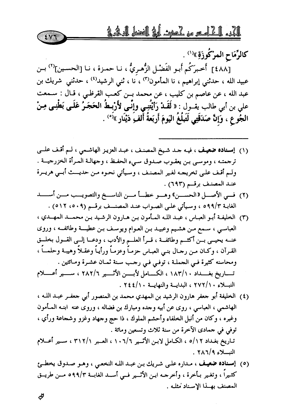 488 - أَخْبَرَكُمْ أَبُو الْفَضْلِ الزُّهْرِيُّ، نا حَمْزَةُ، نا الْحُسَيْنُ بْنُ عُبَيْدِ اللَّهِ، حَدَّثَنِي إِبْرَاهِيمُ، نا الْمَأْمُونُ، نا ثَنِيَّ الرَّشِيدُ، حَدَّثَنِي شَرِيكُ بْنُ عَبْدِ اللَّهِ، عَنْ عَاصِمِ بْنِ كُلَيْبٍ، عَنْ مُحَمَّدِ بْنِ كَعْبٍ الْقُرَظِيِّ، قَالَ: سَمِعْتُ عَلِيَّ بْنَ أَبِي طَالِبٍ، يَقُولُ: «لَقَدْ رَأَيْتُنِي وَإِنِّي لَأَرْبُطُ الْحَجَرَ عَلَى بَطْنِي مِنَ الْجُوعِ، وَإِنَّ صَدَقَتِي لَتَبْلُغُ الْيَوْمَ أَرْبَعَةَ أَلْفَ دِينَارٍ»