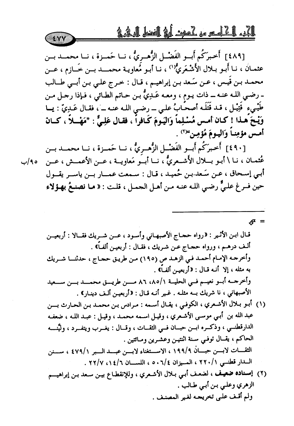 489 - أَخْبَرَكُمْ أَبُو الْفَضْلِ الزُّهْرِيُّ، نا حَمْزَةُ، نا مُحَمَّدُ بْنُ عُثْمَانَ، نا أَبُو بِلَالٍ الْأَشْعَرِيُّ، نا أَبُو مُعَاوِيَةَ مُحَمَّدُ بْنُ خَازِمٍ، عَنْ مُحَمَّدِ بْنِ قَيْسٍ، عَنْ سَعْدِ بْنِ إِبْرَاهِيمَ، قَالَ: خَرَجَ عَلِيُّ بْنُ أَبِي طَالِبٍ، رَضِيَ اللَّهُ عَنْهُ، ذَاتَ يَوْمٍ وَمَعَهُ عَدِيُّ بْنُ حَاتِمٍ الطَّائِيُّ، فَإِذَا رَجُلٌ مِنْ طَيِّئٍ قَتِيلٌ، قَدْ قَتَلَهُ أَصْحَابُ عَلِيٍّ، رَضِيَ اللَّهُ عَنْهُ، فَقَالَ عَدِيُّ: يَا وَيْحَ هَذَا كَانَ أَمْسِ مُسْلِمًا وَالْيَوْمَ كَافِرًا، فَقَالَ عَلِيٌّ: «مَهْلًا، كَانَ أَمْسِ مُؤْمِنًا وَالْيَوْمَ مُؤْمِنٌ»