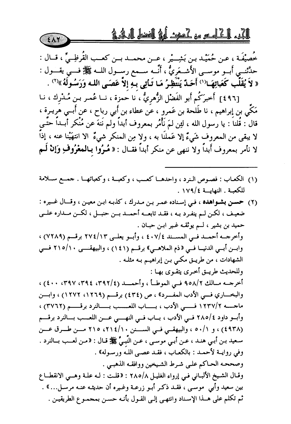 496 - أَخْبَرَكُمْ أَبُو الْفَضْلِ الزُّهْرِيُّ، نا حَمْزَةُ، نا عُمَرُ بْنُ مُدْرِكٍ، نا مَكِّيُّ بْنُ إِبْرَاهِيمَ، نا طَلْحَةُ بْنُ عَمْرٍو، عَنْ عَطَاءِ بْنِ أَبِي رَبَاحٍ، عَنْ أَبِي هُرَيْرَةَ، قَالَ: قُلْنَا: يَا رَسُولَ اللَّهِ، لَئِنْ لَمْ نَأْمُرْ بِمَعْرُوفٍ أَبَدًا وَلَمْ نَنْهَ عَنْ مُنْكَرٍ أَبَدًا حَتَّى لَا يَبْقَى مِنَ الْمَعْرُوفِ شَيْءٌ إِلَّا عَمِلْنَا بِهِ، وَلَا مِنَ الْمُنْكَرِ شَيْءٌ أَلَا انْتَهَيْنَا عَنْهُ، إِذًا لَا نَأْمُرُ بِمَعْرُوفٍ أَبَدًا وَلَا نَنْهَى عَنْ مُنْكَرٍ أَبَدًا فَقَالَ: «مُرُوا بِالْمَعْرُوفِ وَإِنْ لَمْ -[483]- تَفْعَلُوهُ كُلَّهُ، وَانْهَوْا عَنِ الْمُنْكَرِ وَإِنْ لَمْ تَنْتَهُوا عَنْهُ كُلِّهُ»