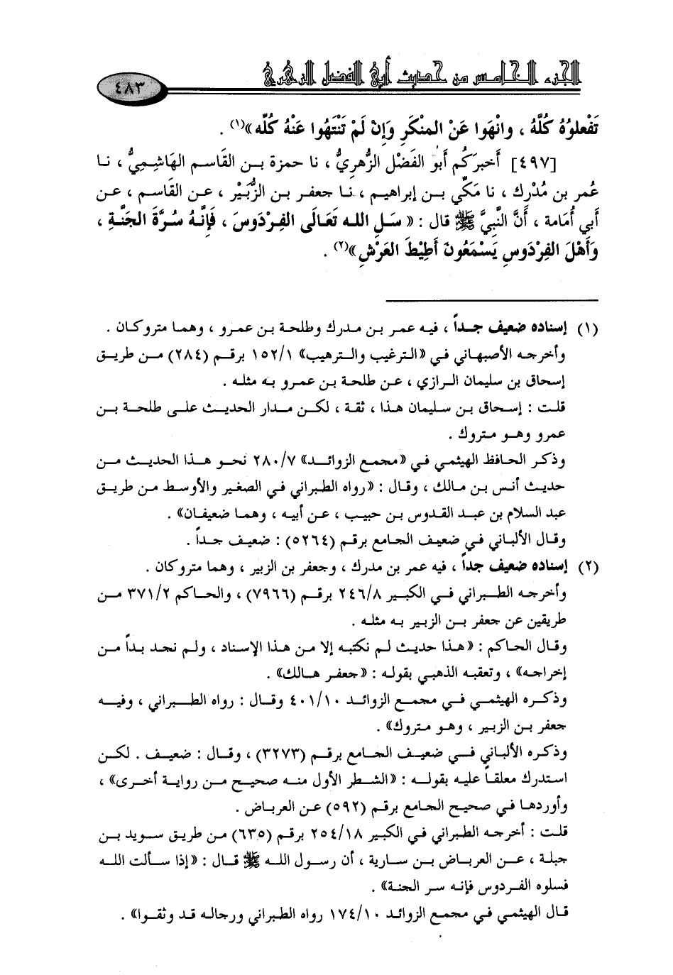 497 - أَخْبَرَكُمْ أَبُو الْفَضْلِ الزُّهْرِيُّ، نا حَمْزَةُ بْنُ الْقَاسِمِ الْهَاشِمِيُّ، نا عُمَرُ بْنُ مُدْرِكٍ، نا مَكِّيُّ بْنُ إِبْرَاهِيمَ، نا جَعْفَرُ بْنُ الزُّبَيْرِ، عَنِ الْقَاسِمِ، عَنْ أَبِي أُمَامَةَ، أَنَّ النَّبِيَّ صَلَّى اللَّهُ عَلَيْهِ وَسَلَّمَ قَالَ: «سَلِ اللَّهَ تَعَالَى الْفِرْدَوْسَ، فَإِنَّهُ سُرَّةُ الْجَنَّةِ، وَأَهْلُ الْفِرْدَوْسِ يَسْمَعُونَ أَطِيطَ الْعَرْشِ»
