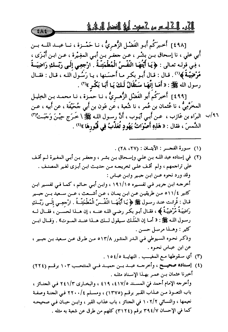 498 - أَخْبَرَكُمْ أَبُو الْفَضْلِ الزُّهْرِيُّ، نا حَمْزَةُ، نا عَبْدُ اللَّهِ بْنُ أَبِي عَلِيٍّ، نا إِسْحَاقُ بْنُ بِشْرٍ، عَنْ جَعْفَرِ بْنِ أَبِي الْمُغِيرَةِ، عَنِ ابْنِ أَبْزَى، فِي قَوْلِهِ تَعَالَى: {يَا أَيَّتُهَا النَّفْسُ الْمُطْمَئِنَّةُ ارْجِعِي إِلَى رَبِّكِ رَاضِيَةً مَرْضِيَّةً} [الفجر: 28]، قَالَ: قَالَ أَبُو بَكْرٍ: مَا أَحْسَنَهَا، يَا رَسُولَ اللَّهِ قَالَ: فَقَالَ رَسُولُ اللَّهِ صَلَّى اللَّهُ عَلَيْهِ وَسَلَّمَ: «أَمَا إِنَّهَا سُتُقَالُ لَكَ يَا أَبَا بَكْرٍ»