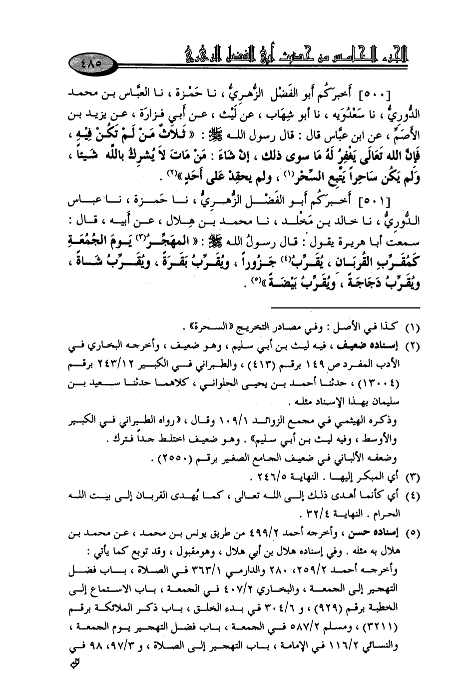501 - أَخْبَرَكُمْ أَبُو الْفَضْلِ الزُّهْرِيُّ، نا حَمْزَةُ، نا عَبَّاسٌ الدُّورِيُّ، نا خَالِدُ بْنُ مَخْلَدٍ، نا مُحَمَّدُ بْنُ هِلَالٍ، عَنْ أَبِيهِ، قَالَ: سَمِعْتُ أَبَا هُرَيْرَةَ، يَقُولُ: قَالَ رَسُولُ اللَّهِ صَلَّى اللَّهُ عَلَيْهِ وَسَلَّمَ: «الْمُهَجِّرُ يَوْمَ الْجُمُعَةِ كَمُقَرِّبِ الْقُرْبَانِ، يُقَرِّبُ جَزُورًا وَيُقَرِّبُ بَقَرَةً، وَيُقَرِّبُ شَاةً، ووَيُقَرِّبُ دَجَاجَةً، وَيُقَرِّبُ بَيْضَةً»