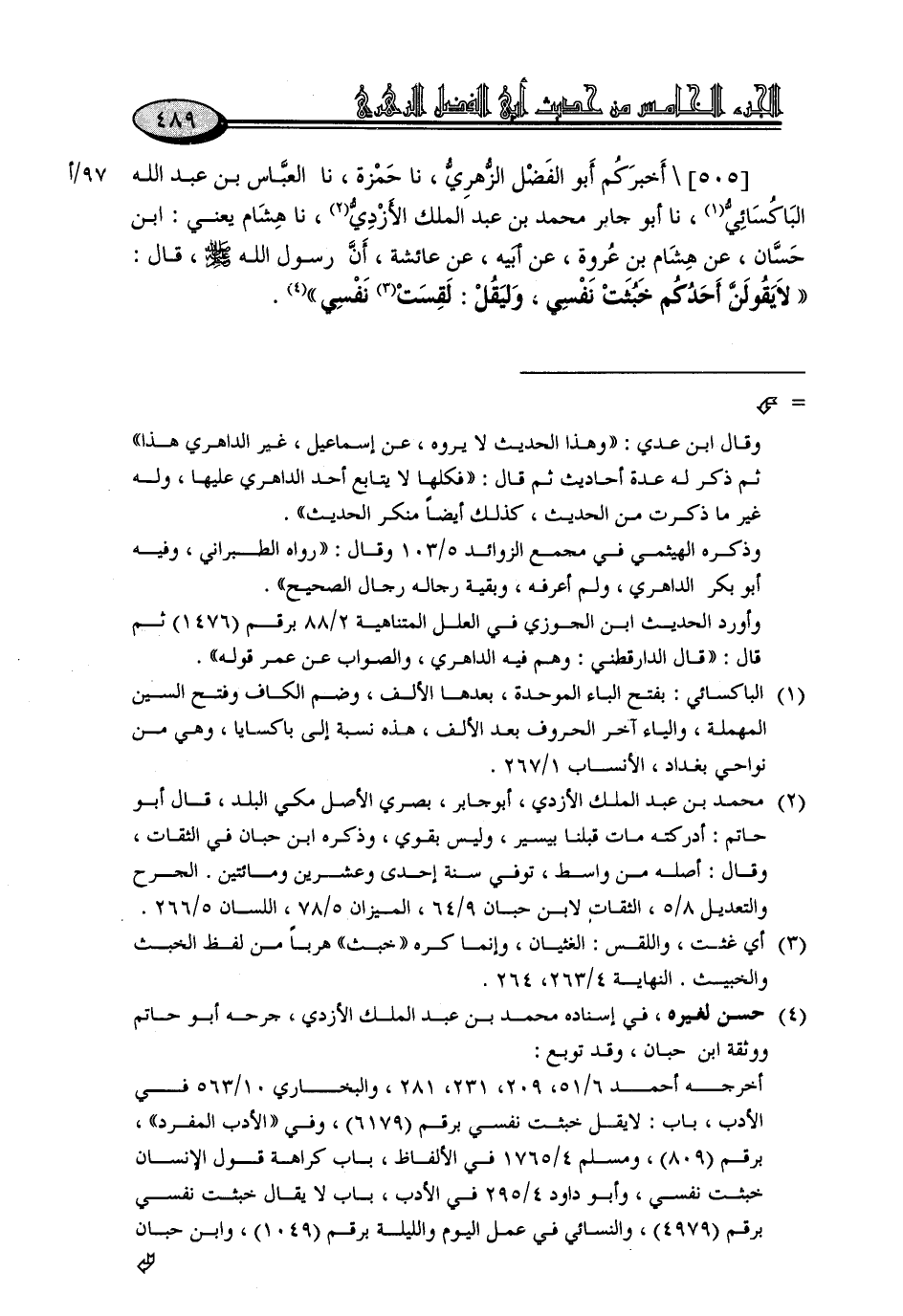 505 - أَخْبَرَكُمْ أَبُو الْفَضْلِ الزُّهْرِيُّ، نا حَمْزَةُ، نا الْعَبَّاسُ بْنُ عَبْدِ اللَّهِ الْبَاكُسَائِيُّ، نا أَبُو جَابِرٍ مُحَمَّدُ بْنُ عَبْدِ الْمَلِكِ الْأَزْدِيُّ، نا هِشَامٌ يَعْنِي ابْنَ حَسَّانَ، عَنْ هِشَامِ بْنِ عُرْوَةَ، عَنْ أَبِيهِ، عَنْ عَائِشَةَ، أَنَّ رَسُولَ اللَّهِ صَلَّى اللَّهُ عَلَيْهِ وَسَلَّمَ قَالَ: " لَا يَقُولَنَّ أَحَدُكُمْ خَبُثَتْ نَفْسِي، وَلْيَقُلْ: لَقِسَتْ نَفْسِي "