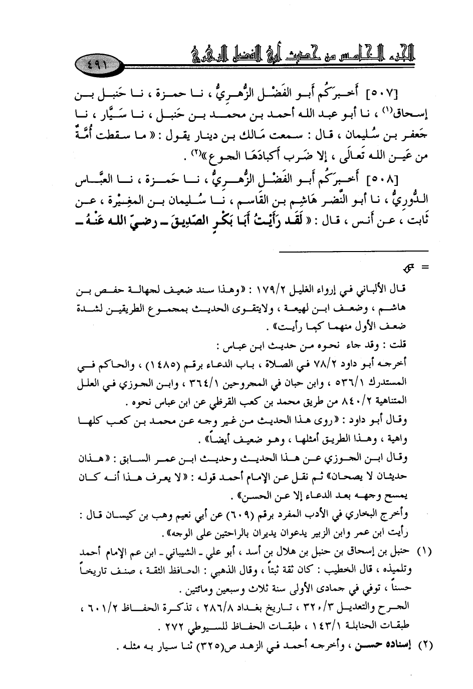 507 - أَخْبَرَكُمْ أَبُو الْفَضْلِ الزُّهْرِيُّ، نا حَمْزَةُ، نا حَنْبَلُ بْنُ إِسْحَاقَ، نا أَبُو عَبْدِ اللَّهِ أَحْمَدُ بْنُ مُحَمَّدِ بْنِ حَنْبَلٍ، نا سَيَّارٌ، نا جَعْفَرُ بْنُ سُلَيْمَانَ، قَالَ: سَمِعْتُ مَالِكَ بْنَ دِينَارٍ، يَقُولُ: «مَا سَقَطَتْ أُمَّةٌ مِنْ عَيْنِ اللَّهِ تَعَالَى، إِلَّا ضَرَبَ أَكْبَادَهَا الْجُوعُ»