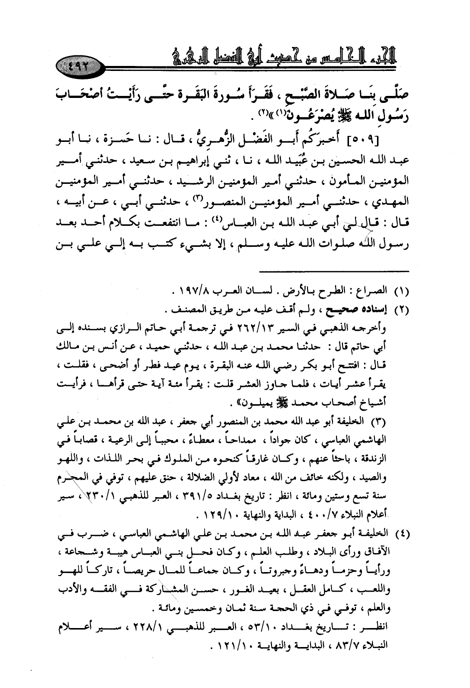 509 - أَخْبَرَكُمْ أَبُو الْفَضْلِ الزُّهْرِيُّ، نا حَمْزَةُ، نا أَبُو عَبْدِ اللَّهِ الْحُسَيْنُ بْنُ عُبَيْدِ اللَّهِ، نا ثني إِبْرَاهِيمُ بْنُ سَعِيدٍ، حَدَّثَنِي أَمِيرُ الْمُؤْمِنِينَ الْمَأْمُونُ، حَدَّثَنِي أَمِيرُ الْمُؤْمِنِينَ الرَّشِيدُ، حَدَّثَنِي أَمِيرُ الْمُؤْمِنِينَ الْمَهْدِيُّ، حَدَّثَنِي أَمِيرُ الْمُؤْمِنِينَ الْمَنْصُورُ، حَدَّثَنِي أَبِي، عَنْ أَبِيهِ، قَالَ: قَالَ لِي أَبِي عَبْدِ اللَّهِ بْنِ الْعَبَّاسِ: مَا انْتَفَعْتُ بِكَلَامٍ أَحَدٍ بَعْدَ رَسُولِ اللَّهِ صَلَوَاتِ اللَّهِ عَلَيْهِ وَسَلَّمَ، إِلَّا بِشَيْءٍ كَتَبَ بِهِ إِلَيَّ عَلِيُّ بْنُ -[493]- أَبِي طَالِبٍ رَضِيَ اللَّهُ عَنْهُ، فَإِنَّهُ كَتَبَ إِلَيَّ: " بِسْمِ اللَّهِ الرَّحْمَنِ الرَّحِيمِ، أَمَا بَعْدُ: يَا أَخِي، فَإِنَّكَ تُسَرُّ بِمَا يَصِيرُ إِلَيْكَ، مِمَّا لَمْ يَكُنْ لِيَفُوتُكَ، وَيَسُرُّكَ مَا لَمْ تَكُنْ تُدْرِكُهُ، فَمَا نِلْتَ مِنَ الدُّنْيَا، يَا أَخِي، فَلَا تَكُنْ بِهِ فَرِحًا، وَمَا فَاتَكَ مِنْهَا فَلَا تَكُنْ عَلَيْهَا حَزِينًا، وَلْيَكُنْ عَمَلُكَ لِمَا بَعْدَ الْمَوْتِ، وَالسَّلَامُ "
