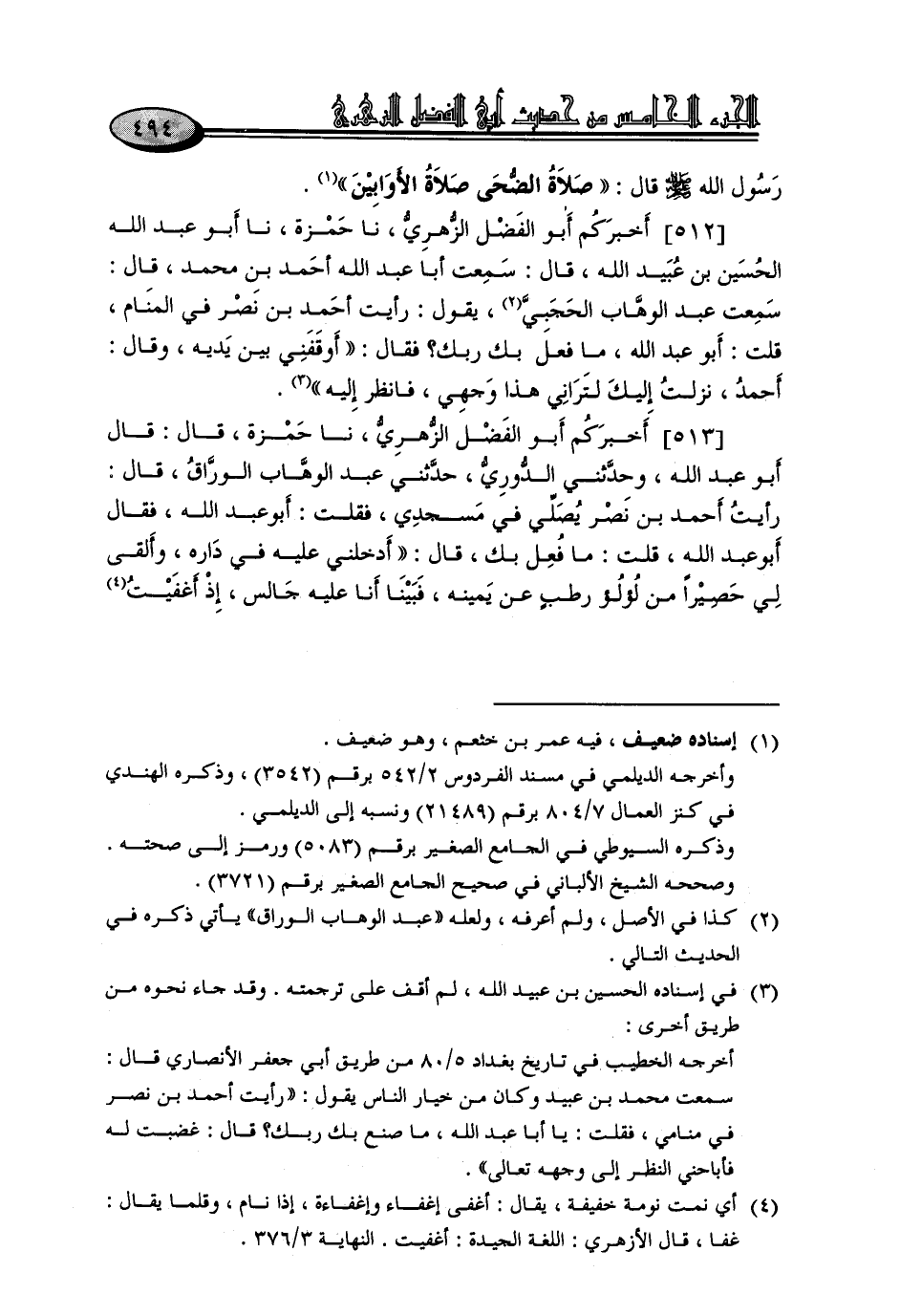 512 - أَخْبَرَكُمْ أَبُو الْفَضْلِ الزُّهْرِيُّ، نا حَمْزَةُ، نا أَبُو عَبْدِ اللَّهِ الْحُسَيْنُ بْنُ عُبَيْدِ اللَّهِ، قَالَ: سَمِعْتُ أَبَا عَبْدَ اللَّهِ أَحْمَدَ بْنَ مُحَمَّدٍ قَالَ: سَمِعْتُ عَبْدَ الْوَهَّابِ الْحَجَبِيَّ، يَقُولُ: " رَأَيْتُ أَحْمَدَ بْنَ نَصْرٍ فِي الْمَنَامِ، قُلْتُ: أَبُو عَبْدِ اللَّهِ، مَا فَعَلَ بِكَ رَبُّكَ؟ فَقَالَ: " أَوْقَفَنِي بَيْنَ يَدَيْهِ، وَقَالَ: أَحْمَدُ نَزَلْتُ إِلَيْكَ لِتَرَانِي هَذَا وَجْهِي، فَانْظُرْ إِلَيْهِ "