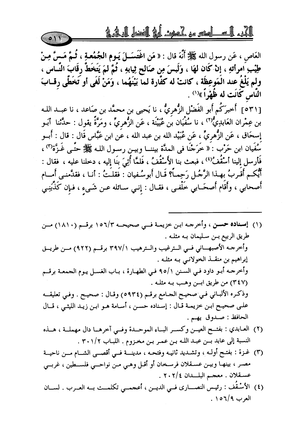 531 - أَخْبَرَكُمْ أَبُو الْفَضْلِ الزُّهْرِيُّ، نا يَحْيَى بْنُ مُحَمَّدِ بْنِ صَاعِدٍ، نا عَبْدُ اللَّهِ بْنُ عِمْرَانَ الْعَابِدِيُّ، نا سُفْيَانُ بْنُ عُيَيْنَةَ، عَنِ الزُّهْرِيِّ، وَمَرَّةً يَقُولُ: حَدَّثَنَا أَبُو إِسْحَاقَ، عَنِ الزُّهْرِيِّ، عَنْ عُبَيْدِ اللَّهِ بْنِ عَبْدِ اللَّهِ، عَنِ ابْنِ عَبَّاسٍ، قَالَ: قَالَ أَبُو سُفْيَانَ بْنُ حَرْبٍ: " خَرَجْنَا فِي الْمُدَّةِ بَيْنَنَا وَبَيْنَ رَسُولِ اللَّهِ صَلَّى اللَّهُ عَلَيْهِ وَسَلَّمَ حَتَّى غَزَّةَ، فَأَرْسَلَ إِلَيْنَا أَسْقُفُ، فَبَعَثَ بِنَا الْأَسْقُفُ، فَلَمَّا أُتِيَ بِنَا إِلَيْهِ، دَخَلْنَا عَلَيْهِ، فَقَالَ: أَيُّكُمْ أَقْرَبُ بِهَذَا الرَّجُلِ رَحِمًا؟ قَالَ أَبُو سُفْيَانَ: فَقُلْتُ: أَنَا، فَقَدَّمَنِي أَمَامَ أَصْحَابِي، وَأَقَامَ أَصْحَابِي خَلْفِي، فَقَالَ: إِنِّي سَائِلُهُ عَنْ شَيْءٍ، فَإِنْ كَذَبَنِي -[512]- فَكَذِّبُوهُ، وَأَمَرَ التُّرْجُمَانَ أَنْ يُخْبِرَهُ، قَالَ أَبُو سُفْيَانَ: وَلَوْ كَذَبْتُهُ مَا كَانَ أَصْحَابِي بِالَّذِينَ يُكَذِّبُونِي، وَلَكِنْ مَنَعَنِي مِنْ ذَلِكَ الْحَيَاءُ، فَقَالَ: كَيْفَ نَسَبُهُ فِيكُمْ؟ قُلْتُ: فِي الذُّرْوَةِ مِنَّا، قَالَ: فَهَلْ أَحَدٌ مِنْ أَهْلِ بَيْتِهِ كَانَ مَلِكًا؟ قُلْتُ: لَا، قَالَ: فَمَنْ تَبِعَهُ؟ قُلْتُ: الضَّعَفَةُ، قَالَ: أَيَرْجِعُ مِمَّنِ اتَّبَعَهُ إِلَيْكُمْ أَحَدٌ؟ فَقُلْتُ: لَا، قَالَ: فَكَيْفَ صِدْقُهُ فِيكُمْ؟ قُلْتُ: كُنَّا نُسَمِّيهِ الْأَمِينَ، قَالَ: كَيْفَ الْحَرْبُ بَيْنَكُمْ وَبَيْنَهُ؟ قُلْتُ: سِجَالٌ، عَلَيْنَا وَلَنَا، قَالَ: كَيْفَ وَفَاؤُهُ؟ قَالَ أَبُو سُفْيَانَ: فَلَمْ تُمْكِنِّي عَلَيْهِ إِلَّا هَذِهِ، قُلْتُ: بَيْنَنَا وَبَيْنَهُ عَهْدٌ، فَلَا نَدْرِي كَيْفَ يَكُونُ؟ فَقَالَ: ذَكَرْتُمْ أَنَّ هَذَا الرَّجُلَ لَيْسَ فِي بَيْتِ مَمْلَكَةٍ، وَلَوْ كَانَ فِي بَيْتِ مَمْلَكَةٍ، قُلْنَا: خَرَجَ يَطْلُبُ مَا كَانَ عَلَيْهِ آبَاؤُهُ، وَقَوْلُكُمْ: إِنَّهُ يُدْعَى الْأَمِينُ، فَهُوَ لَا يَكْذِبُ عَلَيْكُمْ، وَيَكْذِبُ عَلَى اللَّهِ، وَأَمَّا قَوْلُكُمْ نَسَبُهُ، فَكَذَلِكَ الْأَنْبِيَاءُ، لَا تُبْعَثُ إِلَّا بَيْنَ قَوْمِهَا، وَأَمَّا قَوْلُكُمُ: اتَّبَعَهُ الضَّعَفَةُ، فَهَكَذَا أَتْبَاعُ الْأَنْبِيَاءِ، وَأَمَّا قَوْلُكُمْ: لَا يَرْجِعُ مَنِ اتَّبَعَهُ إِلَيْكُمْ، فَكَذَلِكَ حَلَاوَةُ الْإِيمَانِ إِذَا خَالَطَ بَشَاشَةَ الْقَلْبِ، ثُمَّ قَالَ: لَئِنْ كَانَ مَا أَخْبَرْتَنِي حَقًّا لَيُنَازِعُنِّي مَا تَحْتَ قَدَمَيَّ هَاتَيْنِ، وَلَوْ قَدَرْتُ أَنْ أَتْبَعَهُ وَأَغْسِلَ قَدَمَيْهِ، ثُمَّ دَعَا بِالْكِتَابِ الَّذِي جَاءَ بِهِ دِحْيَةُ الْكَلْبِيُّ فَقَرَأَهُ عَلَى رُؤَسَائِهِمْ، فَنَخَرُوا نَخْرَةَ الْوَحْشِ، وَخَاضُوا، فَارْتَفَعَتِ الْأَصْوَاتُ، فَأَمَرَ بِنَا فَأُخْرِجْنَا، فَلَمَّا خَافَهُمْ قَالَ لَهُمْ: إِنَّمَا فَعَلْتُ ذَلِكَ أَخْتَبِرُكُمْ بِهِ، قَالَ أَبُو سُفْيَانَ: فَمَازِلْتُ مُنْذُ ذَلِكَ الْيَوْمَ أَظُنُّ أَنَّهُ نَبِيٌّ حَتَّى أَدْخَلَ اللَّهُ تَعَالَى الْإِسْلَامَ عَلَى بَيْتِي "