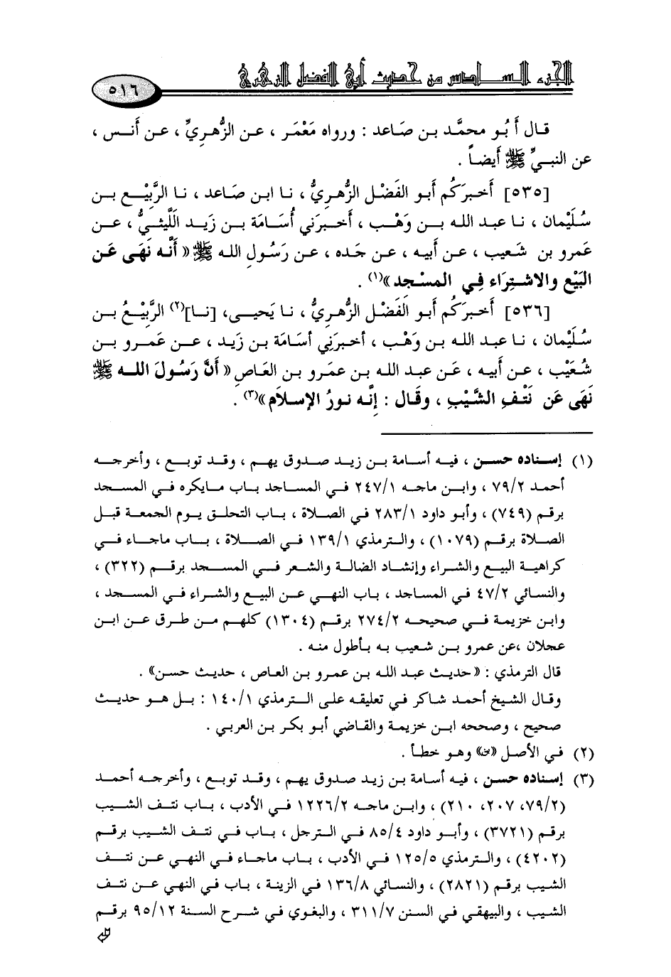 535 - أَخْبَرَكُمْ أَبُو الْفَضْلِ الزُّهْرِيُّ، نا ابْنُ صَاعِدٍ، نا الرَّبِيعُ بْنُ سُلَيْمَانَ، نا عَبْدُ اللَّهِ بْنُ وَهْبٍ، أَخْبَرَنِي أُسَامَةُ بْنُ زَيْدٍ اللَّيْثِيُّ، عَنْ عَمْرِو بْنِ شُعَيْبٍ، عَنْ أَبِيهِ، عَنْ جَدِّهِ، عَنْ رَسُولِ اللَّهِ صَلَّى اللَّهُ عَلَيْهِ وَسَلَّمَ: «أَنَّهُ نَهَى عَنِ الْبَيْعِ وَالِاشْتِرَاءِ فِي الْمَسْجِدِ»