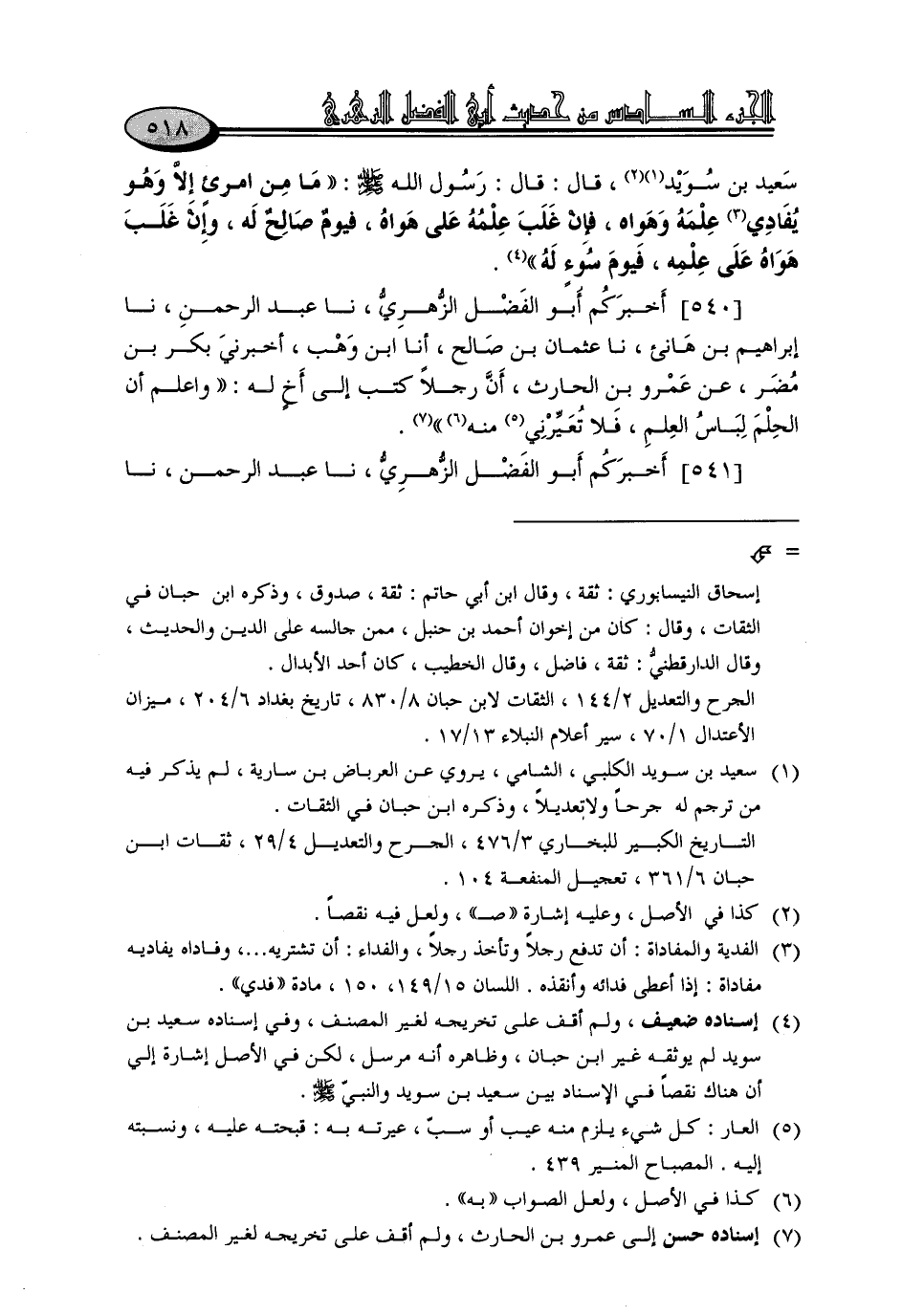 540 - أَخْبَرَكُمْ أَبُو الْفَضْلِ الزُّهْرِيُّ، نا عَبْدُ الرَّحْمَنِ، نا إِبْرَاهِيمُ بْنُ هَانِئٍ، نا عُثْمَانُ بْنُ صَالِحٍ، أنا ابْنُ وَهْبٍ، أَخْبَرَنِي بَكْرُ بْنُ مُضَرٍ، عَنْ عَمْرِو بْنِ الْحَارِثِ، أَنَّ رَجُلًا كَتَبَ إِلَى أَخٍ لَهُ: «وَاعْلَمْ أَنَّ الْحِلْمَ لِبَاسُ الْعِلْمِ، فَلَا تُعَيِّرْنِي مِنْهُ»