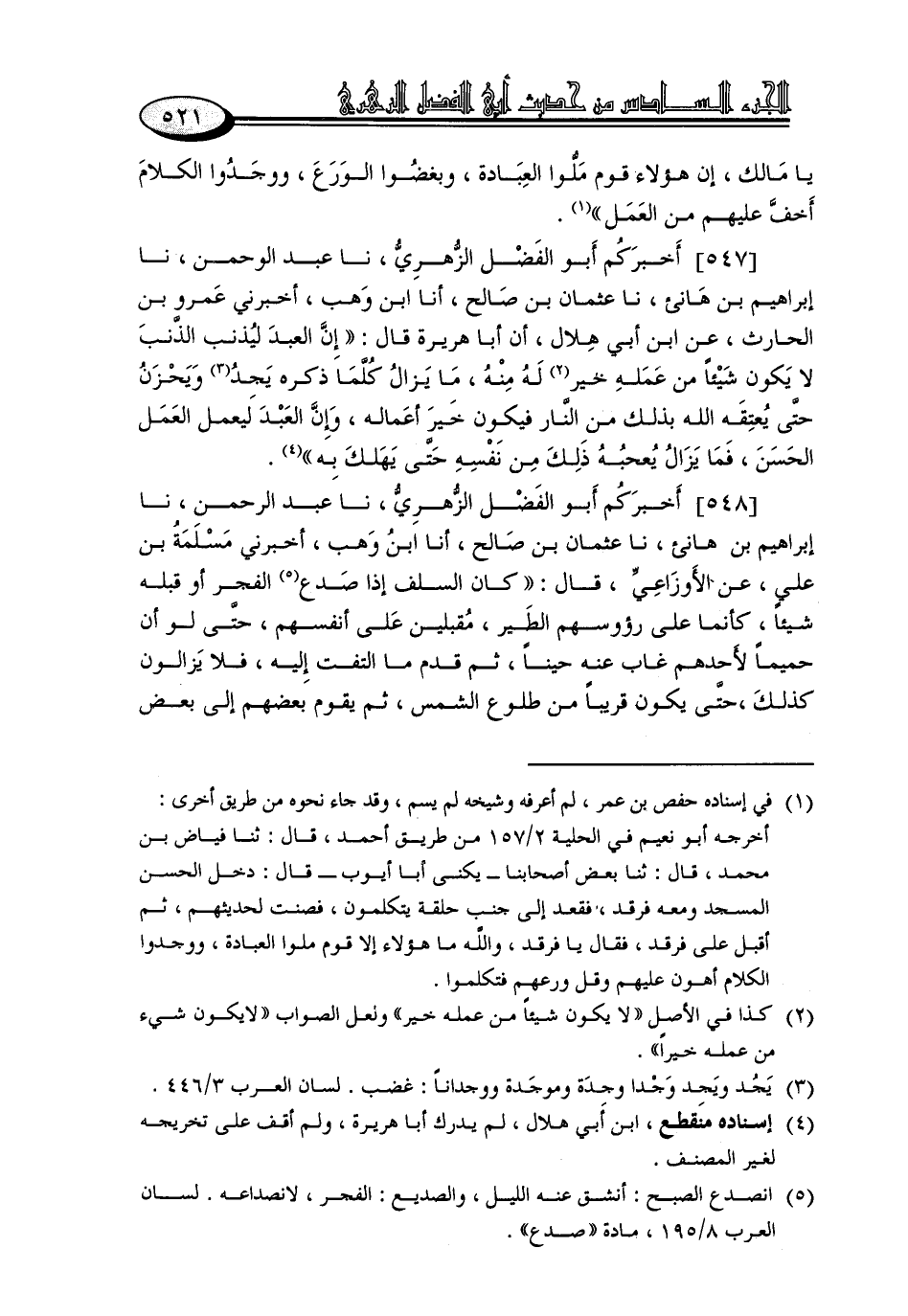 548 - أَخْبَرَكُمْ أَبُو الْفَضْلِ الزُّهْرِيُّ، نا عَبْدُ الرَّحْمَنِ، نا إِبْرَاهِيمُ بْنُ هَانِئٍ، نا عُثْمَانُ بْنُ صَالِحٍ، أنا ابْنُ وَهْبٍ، أَخْبَرَنِي مَسْلَمَةُ بْنُ عُلَيٍّ، عَنِ الْأَوْزَاعِيِّ، قَالَ: «كَانَ السَّلَفُ إِذَا صَدَعَ الْفَجْرُ أَوْ قَبْلَهُ شَيْئًا، كَأَنَّمَا عَلَى رُءُوسِهِمُ الطَّيْرُ، مُقْبِلِينَ عَلَى أَنْفُسِهِمْ، حَتَّى لَوْ أَنَّ حَمِيمًا لِأَحَدِهِمْ غَابَ عَنْهُ حِينًا، ثُمَّ قَدِمَ مَا الْتَفَتَ إِلَيْهِ، فَلَا يَزَالُونَ كَذَلِكَ، حَتَّى يَكُونَ قَرِيبًا مِنْ طُلُوعِ الشَّمْسِ، ثُمَّ يَقُومُ بَعْضُهُمْ إِلَى بَعْضٍ -[522]- فَيَتَحَلَّقُونَ فَأَوَّلُ مَا يُفِيضُونَ فِيهِ أَمْرُ مَعَادِهِمْ وَمَا هُمْ صَائِرُونَ إِلَيْهِ ثُمَّ يَتَحَلَّقُونَ إِلَى الْفِقْهِ وَالْقُرْآنِ»