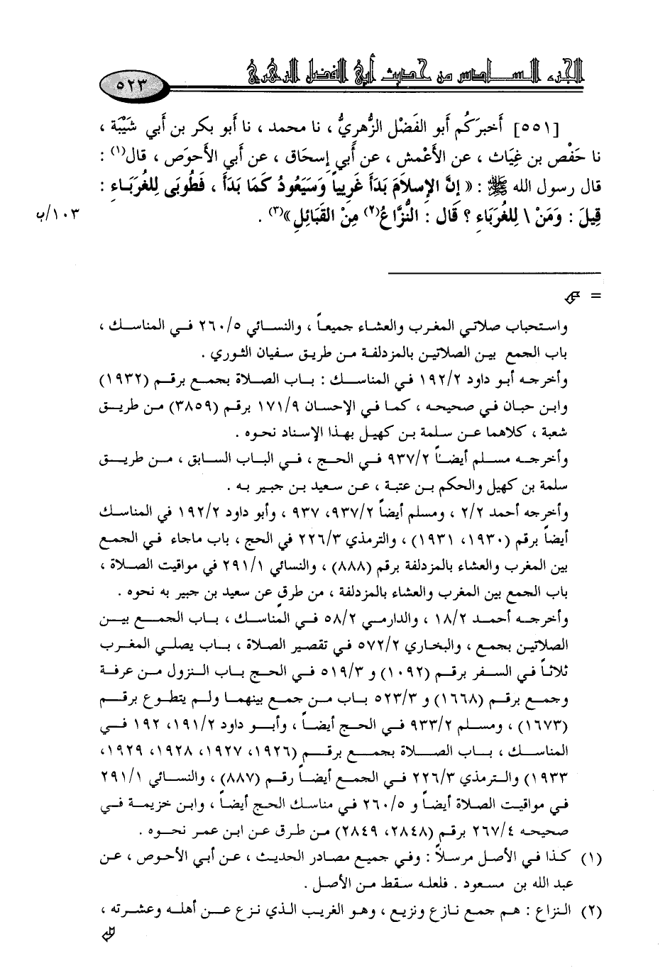 551 - أَخْبَرَكُمْ أَبُو الْفَضْلِ الزُّهْرِيُّ، نا مُحَمَّدٌ، نا أَبُو بَكْرِ بْنُ أَبِي شَيْبَةَ، نا حَفْصُ بْنُ غِيَاثٍ، عَنِ الْأَعْمَشِ، عَنْ أَبِي إِسْحَاقَ، عَنْ أَبِي الْأَحْوَصِ، قَالَ: قَالَ رَسُولُ اللَّهِ صَلَّى اللَّهُ عَلَيْهِ وَسَلَّمَ: «إِنَّ الْإِسْلَامَ بَدَأَ غَرِيبًا وَسَيَعُودُ كَمَا بَدَأَ، فَطُوبَى لِلْغُرَبَاءِ»، قِيلَ: وَمَنِ الْغُرَبَاءُ؟ قَالَ: النُّزَّاعُ مِنَ الْقَبَائِلِ "