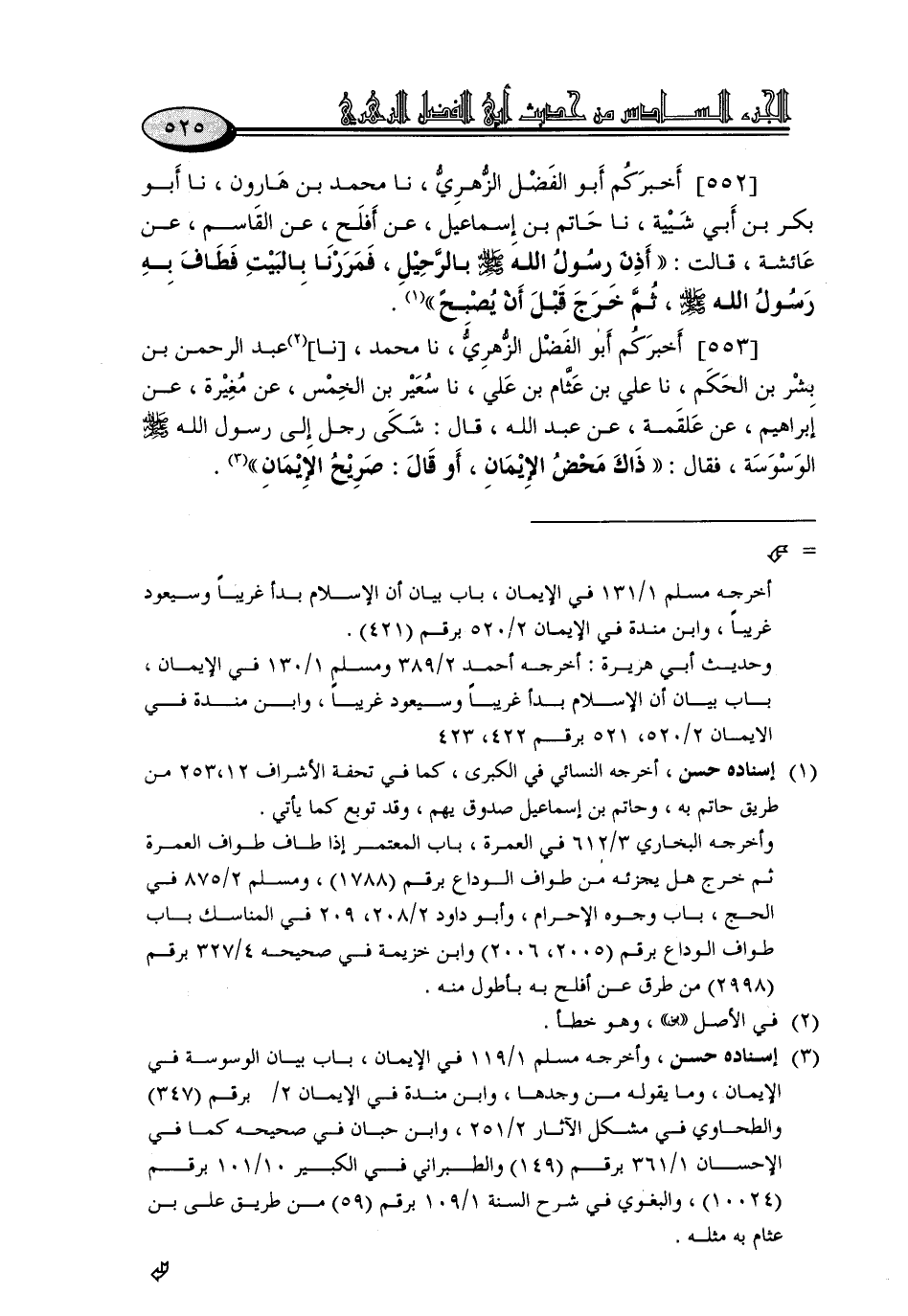 552 - أَخْبَرَكُمْ أَبُو الْفَضْلِ الزُّهْرِيُّ، نا مُحَمَّدُ بْنُ هَارُونَ، نا أَبُو بَكْرِ بْنُ أَبِي شَيْبَةَ، نا حَاتِمُ بْنُ إِسْمَاعِيلَ، عَنْ أَفْلَحَ، عَنِ الْقَاسِمِ، عَنْ عَائِشَةَ، قَالَتْ: «أَذِنَ رَسُولُ اللَّهِ صَلَّى اللَّهُ عَلَيْهِ وَسَلَّمَ بِالرَّحِيلِ، فَمَرَرْنَا بِالْبَيْتِ فَطَافَ بِهِ رَسُولُ اللَّهِ صَلَّى اللَّهُ عَلَيْهِ وَسَلَّمَ، ثُمَّ خَرَجَ قَبْلَ أَنْ يُصْبِحَ»