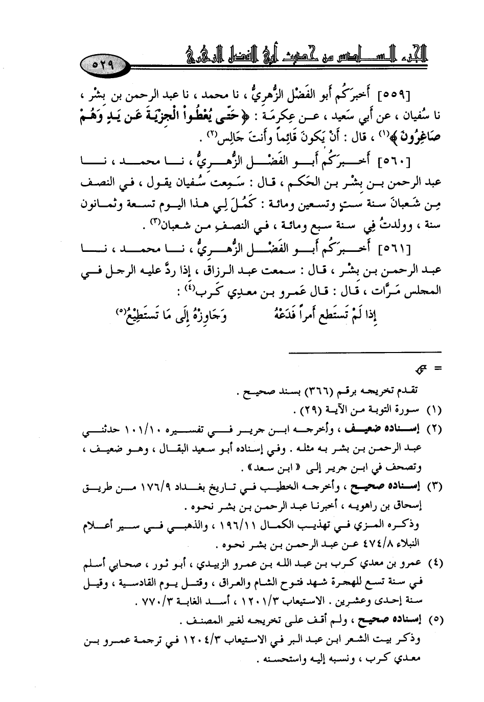 559 - أَخْبَرَكُمْ أَبُو الْفَضْلِ الزُّهْرِيُّ، نا مُحَمَّدٌ، نا عَبْدُ الرَّحْمَنِ بْنُ بِشْرٍ، نا سُفْيَانُ، عَنْ أَبِي سَعِيدٍ، عَنْ عِكْرِمَةَ: " {حَتَّى يُعْطُوا الْجِزْيَةَ عَنْ يَدٍ وَهُمْ صَاغِرُونَ} [التوبة: 29] قَالَ: أَنْ يَكُونَ قَائِمًا وَأَنْتَ جَالِسٌ "