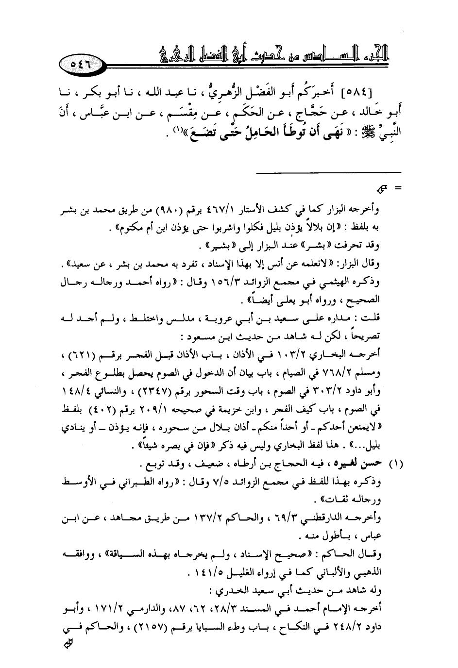 584 - أَخْبَرَكُمْ أَبُو الْفَضْلِ الزُّهْرِيُّ، نا عَبْدُ اللَّهِ، نا أَبُو بَكْرٍ، نا أَبُو خَالِدٍ، عَنْ حَجَّاجٍ، عَنِ الْحَكَمِ، عَنْ مِقْسَمٍ، عَنِ ابْنِ عَبَّاسٍ، أَنَّ النَّبِيَّ صَلَّى اللَّهُ عَلَيْهِ وَسَلَّمَ: «نَهَى أَنْ تُوطَأَ الْحَامِلُ حَتَّى تَضَعَ»