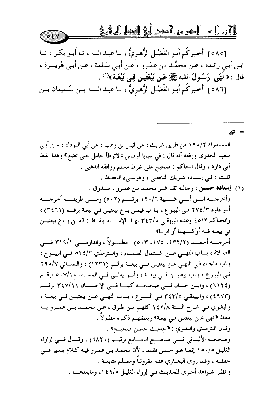 585 - أَخْبَرَكُمْ أَبُو الْفَضْلِ الزُّهْرِيُّ، نا عَبْدُ اللَّهِ، نا أَبُو بَكْرٍ، نا ابْنُ أَبِي زَائِدَةَ، عَنْ مُحَمَّدِ بْنِ عَمْرٍو، عَنْ أَبِي سَلَمَةَ، عَنْ أَبِي هُرَيْرَةَ، قَالَ: «نَهَى رَسُولُ اللَّهِ صَلَّى اللَّهُ عَلَيْهِ وَسَلَّمَ عَنْ بَيْعَتَيْنِ فِي بَيْعَةٍ»