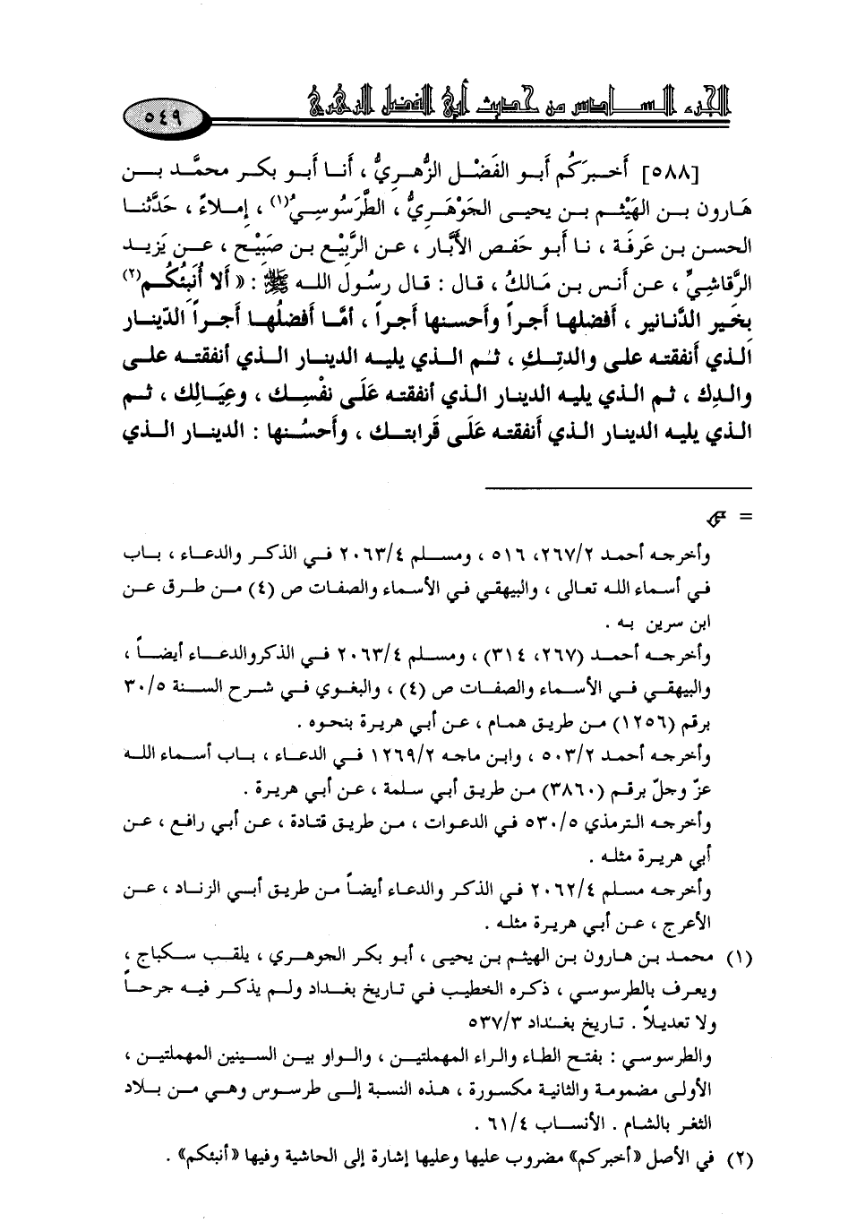 588 - أَخْبَرَكُمْ أَبُو الْفَضْلِ الزُّهْرِيُّ، أنا أَبُو بَكْرٍ مُحَمَّدُ بْنُ هَارُونَ بْنِ الْهَيْثَمِ بْنِ يَحْيَى الْجَوْهَرِيُّ الطُّرَسُوسِيُّ إِمْلَاءً، حَدَّثَنَا الْحَسَنُ بْنُ عَرَفَةَ، نا أَبُو حَفْصٍ الْأَبَّارُ، عَنِ الرَّبِيعِ بْنِ صُبَيْحٍ، عَنْ يَزِيدَ الرَّقَاشِيِّ، عَنْ أَنَسِ بْنِ مَالِكٍ، قَالَ: قَالَ رَسُولُ اللَّهِ صَلَّى اللَّهُ عَلَيْهِ وَسَلَّمَ: " أَلَا أُنَبِّئُكُمْ بِخَيْرِ الدَّنَانِيرِ، أَفْضَلِهَا أَجْرًا وَأَحْسَنِهَا أَجْرًا، أَمَّا أَفْضَلُهَا أَجْرًا الدِّينَارُ الَّذِي أَنْفَقْتَهُ عَلَى وَالِدَتِكَ، ثُمَّ الَّذِي يَلِيهِ الدِّينَارُ الَّذِي أَنْفَقْتَهُ عَلَى وَالِدِكَ، ثُمَّ الَّذِي يَلِيهِ الدِّينَارُ الَّذِي أَنْفَقْتَهُ عَلَى نَفْسِكَ، وَعِيَالِكَ، ثُمَّ الَّذِي يَلِيهِ الدِّينَارُ الَّذِي أَنْفَقْتَهُ عَلَى قَرَابَتِكَ، وَأَحْسَنُهَا: الدِّينَارُ الَّذِي -[550]- أَنْفَقْتَهُ فِي سَبِيلِ اللَّهِ عَزَّ وَجَلَّ "