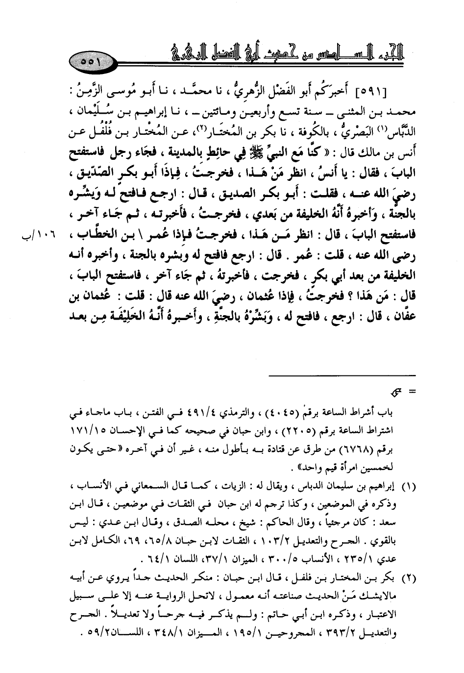 591 - أَخْبَرَكُمْ أَبُو الْفَضْلِ الزُّهْرِيُّ، نا مُحَمَّدٌ، نا أَبُو مُوسَى الزَّمَنُ مُحَمَّدُ بْنُ الْمُثَنَّى سَنَةَ تِسْعٍ وَأَرْبَعِينَ وَمِائَتَيْنِ، نا إِبْرَاهِيمُ بْنُ سُلَيْمَانَ الدَّبَّاسُ الْبَصْرِيُّ، بِالْكُوفَةِ، نا بَكْرُ بْنُ الْمُخْتَارِ، عَنِ الْمُخْتَارِ بْنِ فُلْفُلٍ، عَنْ أَنَسِ بْنِ مَالِكٍ، قَالَ: كُنَّا مَعَ النَّبِيِّ صَلَّى اللَّهُ عَلَيْهِ وَسَلَّمَ فِي حَائِطٍ بِالْمَدِينَةِ، فَجَاءَ رَجُلٌ فَاسْتَفْتَحَ الْبَابَ فَقَالَ: «يَا أَنَسُ انْظُرْ مَنْ هَذَا»، فَخَرَجْتُ، فَإِذَا أَبُو بَكْرٍ الصِّدِّيقُ، رَضِيَ اللَّهُ عَنْهُ، فَقُلْتُ: أَبُو بَكْرٍ الصِّدِّيقُ قَالَ: «ارْجِعْ فَافْتَحْ لَهُ وَبَشِّرْهُ بِالْجَنَّةِ، وَأَخْبِرْهُ أَنَّهُ الْخَلِيفَةُ مِنْ بَعْدِي»، فَخَرَجْتُ، فَأَخْبَرْتُهُ، ثُمَّ جَاءَ آخَرُ، فَاسْتَفْتَحَ الْبَابَ قَالَ: «انْظُرْ مَنْ هَذَا»، فَخَرَجْتُ فَإِذَا عُمَرُ بْنُ الْخَطَّابِ، رَضِيَ اللَّهُ عَنْهُ، قُلْتُ: عُمَرُ. قَالَ: «ارْجِعْ فَافْتَحْ لَهُ وَبَشِّرْهُ بِالْجَنَّةِ، وَأَخْبَرَهُ أَنَّهُ الْخَلِيفَةُ مِنْ بَعْدِ أَبِي بَكْرٍ»، فَخَرَجْتُ، فَأَخْبَرْتُهُ، ثُمَّ جَاءَ آخَرُ، فَاسْتَفْتَحَ الْبَابَ قَالَ: «مَنْ هَذَا»؟ فَخَرَجْتُ، فَإِذَا عُثْمَانُ، رَضِيَ اللَّهُ عَنْهُ، قَالَ: قُلْتُ: عُثْمَانُ بْنُ عَفَّانَ قَالَ: «ارْجِعْ، فَافْتَحْ لَهُ، وَبَشِّرْهُ بِالْجَنَّةِ، وَأَخْبِرْهُ أَنَّهُ الْخَلِيفَةُ مِنْ بَعْدِ -[552]- عُمَرَ وَسَيُصِيبُهُ. . . . .» وَانْدَرَسَ مِنْ كِتَابِ الزُّهْرِيِّ بَقِيَّتُهُ