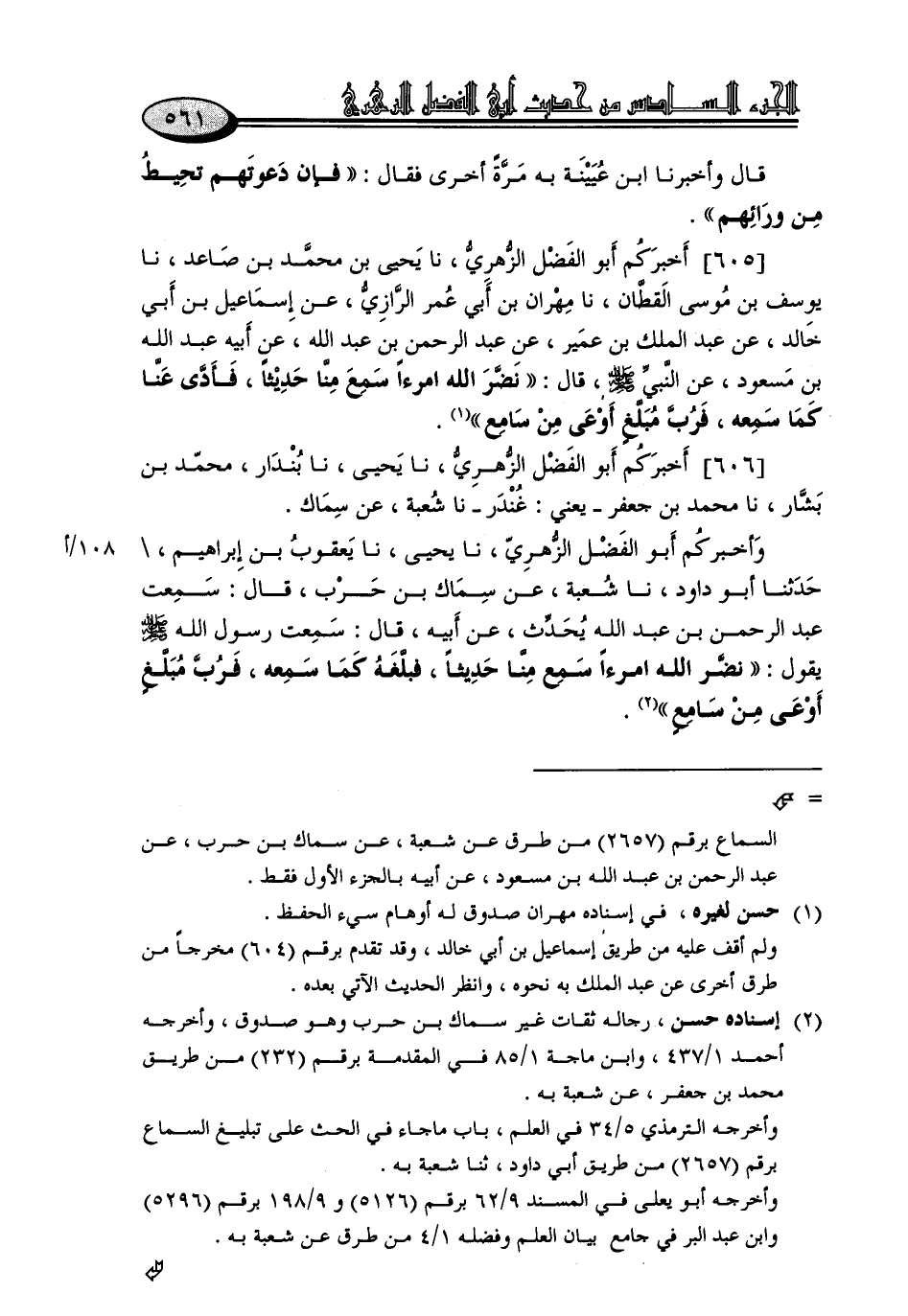 605 - أَخْبَرَكُمْ أَبُو الْفَضْلِ الزُّهْرِيُّ، نا يَحْيَى بْنُ مُحَمَّدِ بْنِ صَاعِدٍ، نا يُوسُفُ بْنُ مُوسَى الْقَطَّانُ، نا مِهْرَانُ بْنُ أَبِي عُمَرَ الرَّازِيُّ، عَنْ إِسْمَاعِيلَ بْنِ أَبِي خَالِدٍ، عَنْ عَبْدِ الْمَلِكِ بْنِ عُمَيْرٍ، عَنْ عَبْدِ الرَّحْمَنِ بْنِ عَبْدِ اللَّهِ، عَنْ أَبِيهِ عَبْدِ اللَّهِ بْنِ مَسْعُودٍ، عَنِ النَّبِيِّ صَلَّى اللَّهُ عَلَيْهِ وَسَلَّمَ قَالَ: «نَضَّرَ اللَّهُ امْرَءًا سَمِعَ مِنَّا حَدِيثًا، فَأَدَّى عَنَّا كَمَا سَمِعَهُ، فَرُبَّ مُبَلَّغٍ أَوْعَى مِنْ سَامِعٍ»