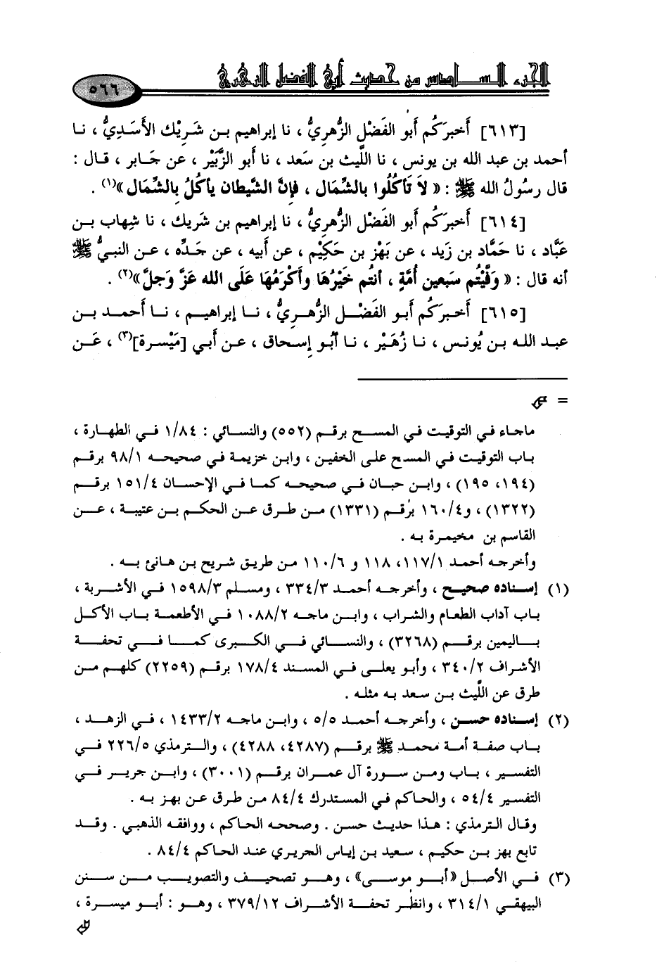 613 - أَخْبَرَكُمْ أَبُو الْفَضْلِ الزُّهْرِيُّ، نا إِبْرَاهِيمُ بْنُ شَرِيكٍ الْأَسَدِيُّ، نا أَحْمَدُ بْنُ عَبْدِ اللَّهِ بْنِ يُونُسَ، نا اللَّيْثُ بْنُ سَعْدٍ، نا أَبُو الزُّبَيْرِ، عَنْ جَابِرٍ، قَالَ: قَالَ رَسُولُ اللَّهِ صَلَّى اللَّهُ عَلَيْهِ وَسَلَّمَ: «لَا تَأْكُلُوا بِالشِّمَالِ، فَإِنَّ الشَّيْطَانَ يَأْكُلُ بِالشِّمَالِ»
