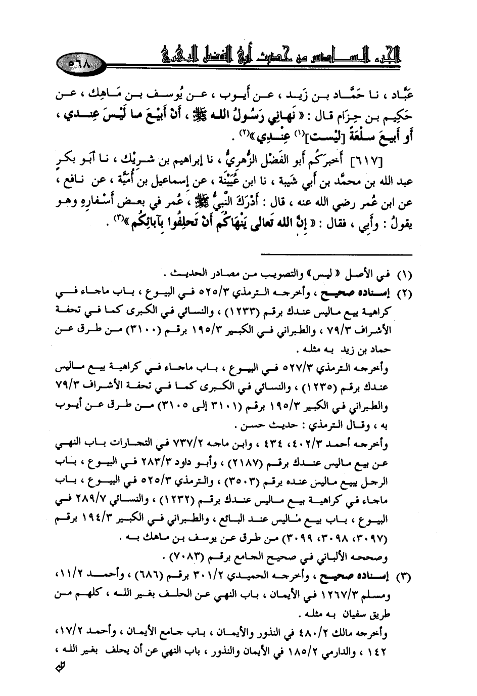 617 - أَخْبَرَكُمْ أَبُو الْفَضْلِ الزُّهْرِيُّ، نا إِبْرَاهِيمُ بْنُ شَرِيكٍ، نا أَبُو بَكْرٍ عَبْدُ اللَّهِ بْنُ مُحَمَّدِ بْنِ أَبِي شَيْبَةَ، نا ابْنُ عُيَيْنَةَ، عَنْ إِسْمَاعِيلَ بْنِ أُمَيَّةَ، عَنْ نَافِعٍ، عَنِ ابْنِ عُمَرَ، رَضِيَ اللَّهُ عَنْهُ قَالَ: أَدْرَكَ النَّبِيُّ صَلَّى اللَّهُ عَلَيْهِ وَسَلَّمَ، عُمَرَ فِي بَعْضِ أَسْفَارِهِ وَهُوَ يَقُولُ: وَأَبِي، فَقَالَ: «إِنَّ اللَّهَ تَعَالَى يَنْهَاكُمْ أَنْ تَحْلِفُوا بِآبَائِكُمْ»