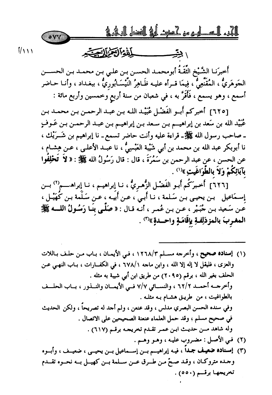 625 - أَخْبَرَنَا الشَّيْخُ الثِّقَةُ أَبُو مُحَمَّدٍ الْحَسَنُ بْنُ عَلِيِّ بْنِ مُحَمَّدِ بْنِ الْحَسَنِ الْجَوْهَرِيُّ الْمُقَنَّعِيُّ، فِيمَا قَرَأَهُ عَلَيْهِ ظَاهِرٌ النَّيْسَابُورِيُّ بِبَغْدَادَ، وَأَنَا حَاضِرٌ أَسْمَعُ وَهُوَ يَسْمَعُ فَأَقَرَّ بِهِ فِي شَعْبَانَ مِنْ سَنَةِ أَرْبَعٍ وَخَمْسِينَ وَأَرْبَعْ مَائَةٍ، أَخْبَرَكُمْ أَبُو الْفَضْلِ عُبَيْدُ اللَّهِ بْنُ عَبْدِ الرَّحْمَنِ بْنِ مُحَمَّدِ بْنِ عُبَيْدِ اللَّهِ بْنِ سَعْدِ بْنِ إِبْرَاهِيْمَ بْنِ سَعْدِ بْنِ إِبْرَاهِيمَ بْنِ عَبْدِ الرَّحْمَنِ بْنِ عَوْفٍ، صَاحِبِ رَسُولِ اللَّهِ صَلَّى اللَّهُ عَلَيْهِ وَسَلَّمَ قِرَاءَةً عَلَيْهِ وَأَنْتَ حَاضِرٌ تَسْمَعُ قَالَ: نا إِبْرَاهِيمُ بْنُ شَرِيكٍ، نا أَبُو بَكْرٍ عَبْدُ اللَّهِ بْنُ مُحَمَّدِ بْنِ أَبِي شَيْبَةَ الْعَبْسِيُّ، نا عَبْدُ الْأَعْلَى، عَنْ هِشَامٍ، عَنِ الْحَسَنِ، عَنْ عَبْدِ الرَّحْمَنِ بْنِ سَمُرَةَ، قَالَ: قَالَ رَسُولُ اللَّهِ صَلَّى اللَّهُ عَلَيْهِ وَسَلَّمَ: «لَا تَحْلِفُوا بِآبَائِكُمْ وَلَا بِالطَّوَاغِيتِ»