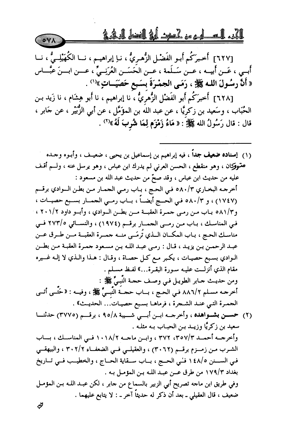 627 - أَخْبَرَكُمْ أَبُو الْفَضْلِ الزُّهْرِيُّ، نا إِبْرَاهِيمُ، نا الْكُهَيْلِيُّ، نا أَبِي، عَنْ أَبِيهِ، عَنْ سَلَمَةَ، عَنِ الْحَسَنِ الْعُرَنِيِّ، عَنِ ابْنِ عَبَّاسٍ: «أَنَّ رَسُولَ اللَّهِ صَلَّى اللَّهُ عَلَيْهِ وَسَلَّمَ رَمَى الْجَمْرَةَ بِسَبْعِ حَصَيَاتٍ»