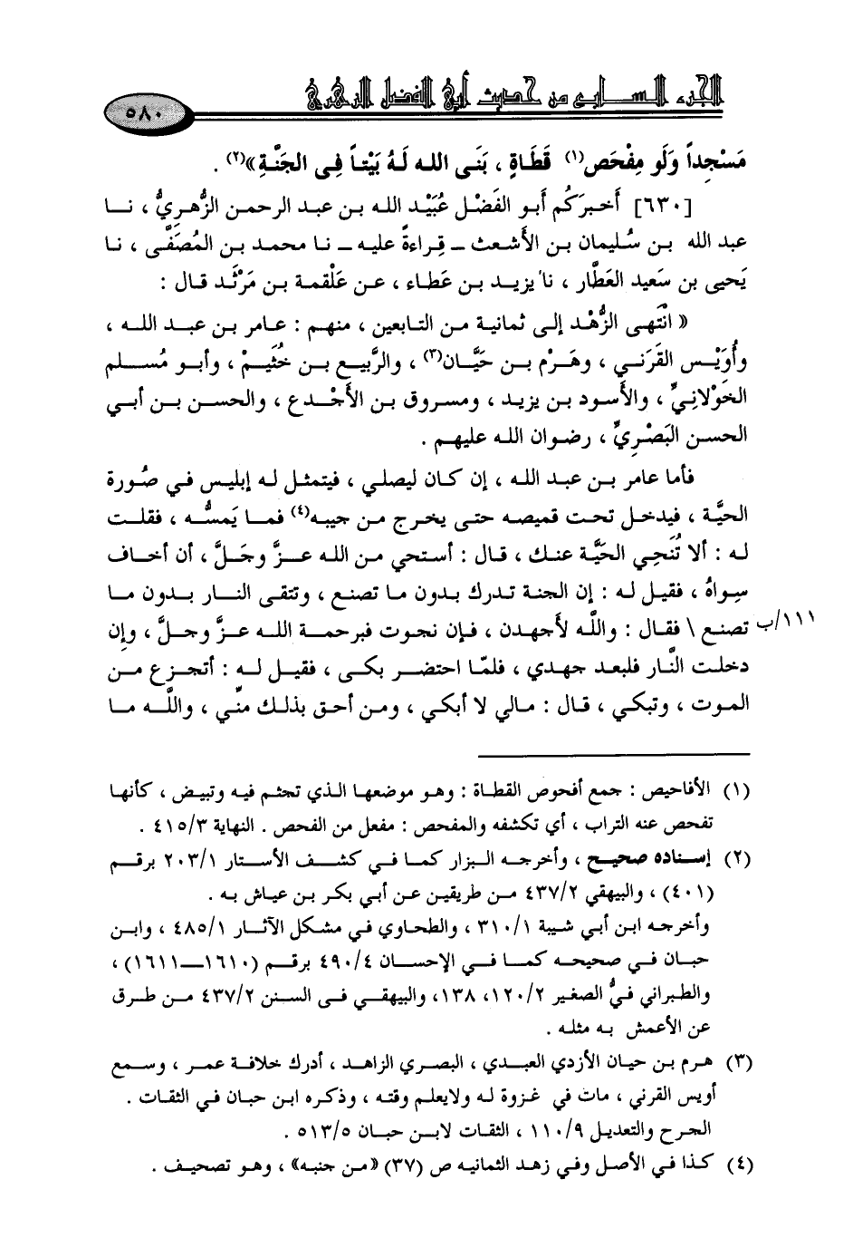 630 - أَخْبَرَكُمْ أَبُو الْفَضْلِ الزُّهْرِيُّ، نا عَبْدُ اللَّهِ بْنُ سُلَيْمَانَ بْنِ الْأَشْعَثَ قِرَاءَةً عَلَيْهِ، نا مُحَمَّدُ بْنُ الْمُصَفَّى، نا يَحْيَى بْنُ سَعِيدٍ الْعَطَّارُ، نا يَزِيدُ بْنُ عَطَاءٍ، عَنْ عَلْقَمَةَ بْنِ مَرْثَدٍ، قَالَ: انْتَهَى الزُّهْدُ إِلَى ثَمَانِيَةِ مِنَ التَّابِعِينَ، مِنْهُمْ: عَامِرُ بْنُ عَبْدِ اللَّهِ، وَأُوَيْسٌ الْقَرَنِيُّ، وَهَرِمُ بْنُ حَيَّانَ، وَالرَّبِيعُ بْنُ خُثَيْمٍ، وَأَبُو مُسْلِمٍ الْخَوْلَانِيُّ، وَالْأَسْوَدُ بْنُ يَزِيدَ، وَمَسْرُوقُ بْنُ الْأَجْدَعِ، وَالْحَسَنُ بْنُ أَبِي الْحَسَنِ الْبَصْرِيُّ، رِضْوَانُ اللَّهِ عَلَيْهِمْ. فَأَمَّا عَامِرُ بْنُ عَبْدِ اللَّهِ، إِنْ كَانَ لِيُصَلِّي، فَيَتَمَثَّلُ لَهُ إِبْلِيسُ فِي صُورَةِ الْحَيَّةِ، فَيَدْخُلُ تَحْتَ قَمِيصِهِ حَتَّى يَخْرُجُ مِنْ جَيْبِهِ فَمَا يَمَسُّهُ، فَقُلْتُ لَهُ: أَلَا تُنَحِّي الْحَيَّةَ عَنْكَ؟ قَالَ: أَسْتَحِي مِنَ اللَّهِ عَزَّ وَجَلَّ أَنْ أَخَافَ سِوَاهُ، فَقِيلَ لَهُ: إِنَّ الْجَنَّةَ تُدْرَكُ بِدُونِ مَا تَصْنَعُ، وَتُتَّقَى النَّارُ بِدُونِ مَا تَصْنَعُ، فَقَالَ: وَاللَّهِ لَأَجْهَدَنَّ، فَإِنْ نَجَوْتُ فَبِرَحْمَةِ اللَّهِ عَزَّ وَجَلَّ، وَإِنْ دَخَلْتُ النَّارَ فَلِبُعْدِ جُهْدِي، فَلَمَّا احْتُضِرَ بَكَى، فَقِيلَ لَهُ: أَتَجْزَعُ مِنَ الْمَوْتِ، وَتَبْكِي، قَالَ: مَالِي لَا أَبْكِي، وَمَنْ أَحَقُّ بِذَلِكَ مِنِّي، وَاللَّهِ مَا -[581]- أَبْكِي جَزَعًا مِنَ الْمَوْتِ وَلَا حِرْصًا عَلَى دُنْيَاكُمْ رَغْبَةً فِيهَا، وَلَكِنِّي أَبْكِى عَلَى ظَمَأِ الْهَوَاجِرِ وَقِيَامِ لَيْلِ الشِّتَاءِ، وَكَانَ يَقُولُ: ألهى فِي الدُّنْيَا الْهُمُومُ وَالْأَحْزَانُ، وَفِي الْآخِرَةِ الْحِسَابُ وَالْعَذَابُ، فَأَيْنَ الرَّوْحُ وَالْفَرَجُ. وَأَمَّا الرَّبِيعُ بْنُ خُثَيْمٍ، فَقِيلَ لَهُ حِينَ أَصَابَهُ الْفَالِجُ: لَوْ تَدَاوَيْتَ، قَالَ: قَدْ عَلِمْتُ أَنَّ الدَّوَاءَ حَقٌّ، وَلَكِنِّي ذَكَرْتُ: {وَعَادًا وَثَمُودَ وَأَصْحَابَ الرَّسِّ وَقُرُونًا بَيْنَ ذَلِكَ كَثِيرًا} [الفرقان: 38]، وَكَانَتْ فِيهِمُ الْأَوْجَاعُ وَكَانَتْ فِيهِمُ الْأَطِبَّاءُ، فَمَا بَقِيَ الْمُدَاوِي وَالْمُدَاوَى، وَقَالَ غَيْرُهُ: لَا النَّاعِتُ وَلَا الْمَنْعُوتُ لَهُ، وَقِيلَ لَهُ: أَلَا تُذَكِّرُ النَّاسَ، قَالَ: مَا أَنَا عَنْ نَفْسِي بِرَاضٍ، فَأَتَفَرَّغَ مِنْ ذَمِّهَا إِلَى ذَمِّ النَّاسِ، إِنَّ النَّاسَ خَافُوا اللَّهَ عَزَّ وَجَلَّ، فِي ذُنُوبِ النَّاسِ وَأَصَرُّوا عَلَى ذُنُوبِهِمْ، قَالَ: فَقِيلَ لَهُ: كَيْفَ أَصْبَحْتَ؟ قَالَ: أَصْبَحْنَا ضُعَفَاءَ مُذْنِبِينَ، نَأْكُلُ أَرْزَاقَنَا وَنَنْتَظِرُ آجَالَنَا قَالَ: وَكَانَ ابْنُ مَسْعُودٍ إِذَا رَآهُ قَالَ: {وَبَشِّرِ الْمُخْبِتِينَ} [الحج: 34]. أَمَا لَوْ رَآكَ مُحَمَّدٌ صَلَّى اللَّهُ عَلَيْهِ وَسَلَّمَ لَأَحَبَّكَ، وَكَانَ الرَّبِيعُ بْنُ خُثَيْمٍ يَقُولُ: أَمَّا بَعْدُ: فَأَعِدَّ زَادَكَ، وَخُذْ فِي جِهَازِكَ، وَكُنْ وَصِيَّ نَفْسِكَ. وَأَمَّا أَبُو مُسْلِمٍ الْخَوْلَانِيُّ، فَلَمْ يُجَالِسْ أَحَدًا قَطُّ فَتَكَلَّمَ فِي شَيْءٍ مِنْ أَمْرِ الدُّنْيَا، إِلَّا تَحَوَّلَ عَنْهُ، فَدَخَلَ ذَاتَ يَوْمٍ الْمَسْجِدَ، فَنَظَرَ إِلَى قَوْمٍ قَدِ اجْتَمَعُوا، فَرْجَى أَنْ يَكُونُوا عَلَى ذِكْرٍ وَخَيْرٍ، فَجَلَسَ إِلَيْهِمْ، فَإِذَا بَعْضُهُمْ يَقُولُ: قَدِمَ غُلَامٌ لِي فَأَصَابَ كَذَا وَكَذَا، وَقَالَ الْآخَرُ: جَهَّزْتُ غُلَامِي، فَنَظَرَ إِلَيْهِمْ فَقَالَ: سُبْحَانَ اللَّهِ أَتَدْرُونَ مَا مَثَلِي وَمَثَلُكُمْ، كَرَجُلٍ أَصَابَهُ مَطَرٌ غَزِيرٌ وَابِلٌ، فَالْتَفَتَ فَإِذَا هُوَ بِمِصْرَاعَيْنِ عَظِيمَيْنِ 