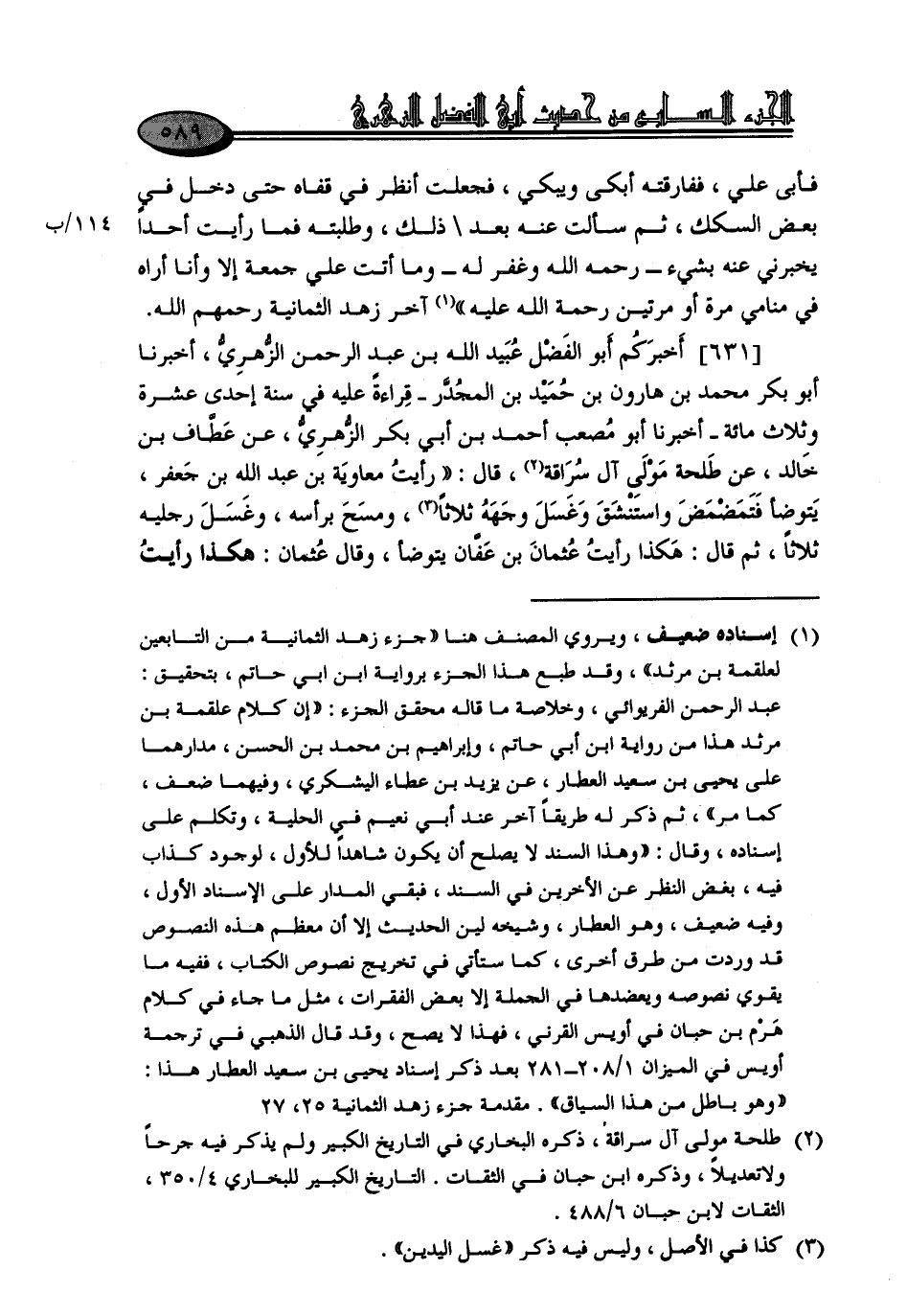 631 - أَخْبَرَكُمْ أَبُو الْفَضْلِ الزُّهْرِيُّ، أَخْبَرَنَا أَبُو بَكْرٍ مُحَمَّدُ بْنُ هَارُونَ بْنِ حُمَيْدِ بْنِ الْمُجَدَّرِ قِرَاءَةً عَلَيْهِ فِي سَنَةِ إِحْدَى عَشْرَةَ وَثَلَاثِ مِائَةٍ، أَخْبَرَنَا أَبُو مُصْعَبٍ أَحْمَدُ بْنُ أَبِي بَكْرٍ الزُّهْرِيُّ، عَنْ عَطَّافِ بْنِ خَالِدٍ، عَنْ طَلْحَةَ مَوْلَى آلِ سُرَاقَةَ قَالَ: " رَأَيْتُ مُعَاوِيَةَ بْنَ عَبْدِ اللَّهِ بْنِ جَعْفَرٍ، يَتَوَضَّأُ فَتَمَضْمَضَ وَاسْتَنْشَقَ وَغَسَلَ وَجْهَهُ ثَلَاثًا، وَمَسَحَ بِرَأْسِهِ، وَغَسَلَ رِجْلَيْهِ ثَلَاثًا، ثُمَّ قَالَ: هَكَذَا رَأَيْتُ عُثْمَانَ بْنَ عَفَّانَ يَتَوَضَّأُ، وَقَالَ عُثْمَانُ: هَكَذَا رَأَيْتُ -[590]- رَسُولَ اللَّهِ صَلَّى اللَّهُ عَلَيْهِ وَسَلَّمَ يَتَوَضَّأُ "