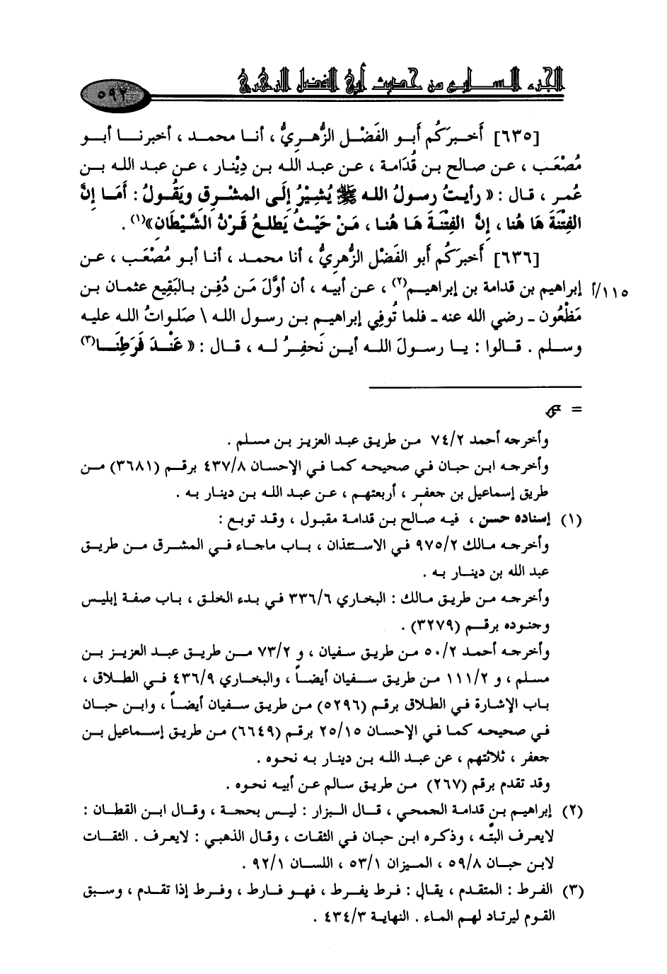 635 - أَخْبَرَكُمْ أَبُو الْفَضْلِ الزُّهْرِيُّ، أنا مُحَمَّدٌ، أَخْبَرَنَا أَبُو مُصْعَبٍ، عَنْ صَالِحِ بْنِ قُدَامَةَ، عَنْ عَبْدِ اللَّهِ بْنِ دِينَارٍ، عَنْ عَبْدِ اللَّهِ بْنِ عُمَرَ، قَالَ: رَأَيْتُ رَسُولَ اللَّهِ صَلَّى اللَّهُ عَلَيْهِ وَسَلَّمَ يُشِيرُ إِلَى الْمَشْرِقِ وَيَقُولُ: «أَمَا إِنَّ الْفِتْنَةَ هَاهُنَا، إِنَّ الْفِتْنَةَ هَاهُنَا، مِنْ حَيْثُ يَطْلُعُ قَرْنُ الشَّيْطَانِ»