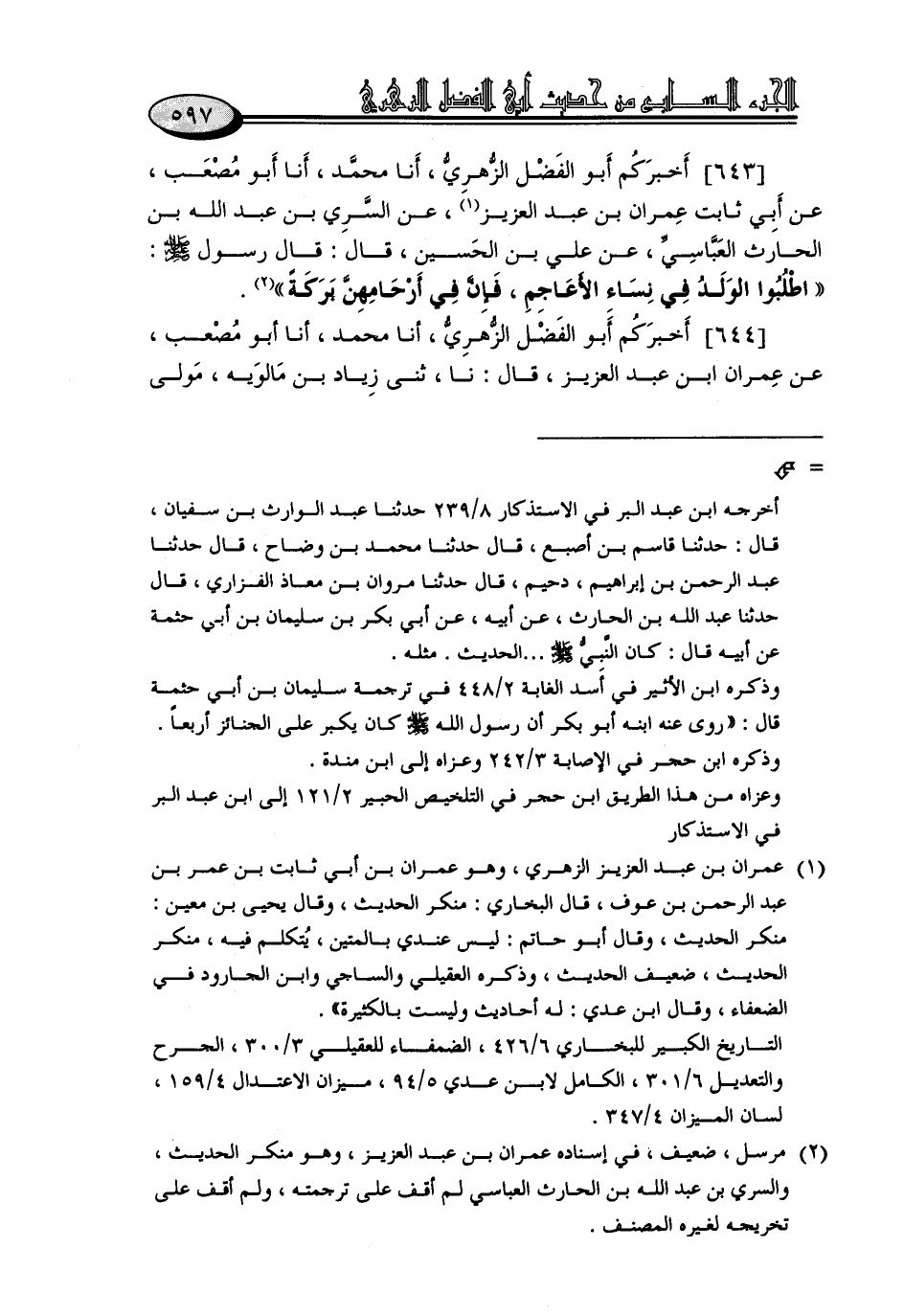 643 - أَخْبَرَكُمْ أَبُو الْفَضْلِ الزُّهْرِيُّ، أنا مُحَمَّدٌ، أنا أَبُو مُصْعَبٍ، عَنْ أَبِي ثَابِثٍ عِمْرَانَ بْنِ عَبْدِ الْعَزِيزِ، عَنِ السَّرِيِّ بْنِ عَبْدِ اللَّهِ بْنِ الْحَارِثِ الْعَبَاسِيِّ، عَنْ عَلِيِّ بْنِ الْحُسَيْنِ، قَالَ: قَالَ رَسُولُ اللَّهِ صَلَّى اللَّهُ عَلَيْهِ وَسَلَّمَ: «اطْلُبُوا الْوَلَدَ مِنْ نِسَاءِ الْأَعَاجِمِ، فَإِنَّ فِي أَرْحَامِهِنَّ بَرَكَةً»