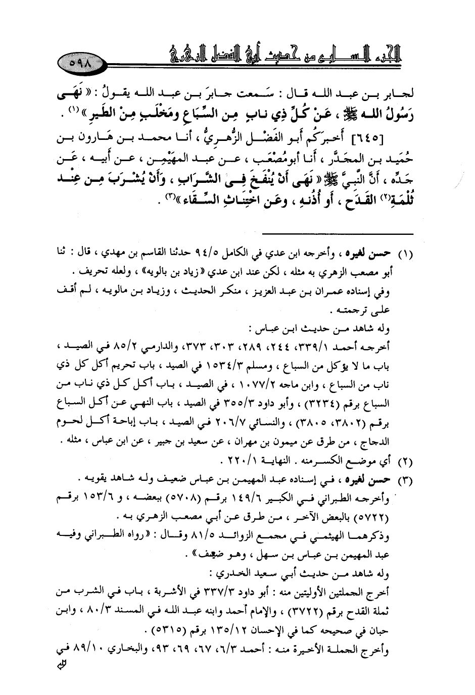 645 - أَخْبَرَكُمْ أَبُو الْفَضْلِ الزُّهْرِيُّ، أنا مُحَمَّدُ بْنُ هَارُونَ بْنِ حُمَيْدِ بْنِ الْمُجَدَّرِ، أنا أَبُو مُصْعَبٍ، عَنْ عَبْدِ الْمُهَيْمِنِ، عَنْ أَبِيهِ، عَنْ جَدِّهِ، أَنَّ النَّبِيَّ صَلَّى اللَّهُ عَلَيْهِ وَسَلَّمَ «نَهَى أَنْ يُنْفَخَ فِي الشَّرَابِ، وَأَنْ يُشْرَبَ مِنْ عِنْدِ ثُلْمَةِ الْقَدَحِ، أَوْ أُذُنِهِ، وَعَنِ اخْتِنَاثِ السِّقَاءِ»