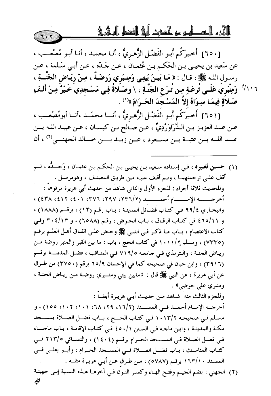 650 - أَخْبَرَكُمْ أَبُو الْفَضْلِ الزُّهْرِيُّ، أنا مُحَمَّدٌ، أنا أَبُو مُصْعَبٍ، عَنْ سَعِيدِ بْنِ يَحْيَى بْنِ الْحَكَمِ بْنِ عُثْمَانَ، عَنْ جَدِّهِ، عَنْ أَبِي سَلَمَةَ، عَنْ رَسُولِ اللَّهِ صَلَّى اللَّهُ عَلَيْهِ وَسَلَّمَ قَالَ: «مَا بَيْنَ بَيْتِي وَمِنْبَرِي رَوْضَةٌ مِنْ رِيَاضِ الْجَنَّةِ، وَمِنْبَرِي عَلَى تُرْعَةٍ مِنْ تُرَعِ الْجَنَّةِ، وَصَلَاةٌ فِي مَسْجِدِي خَيْرٌ مِنْ أَلْفِ صَلَاةٍ فِيمَا سِوَاهُ إِلَّا الْمَسْجِدَ الْحَرَامَ»